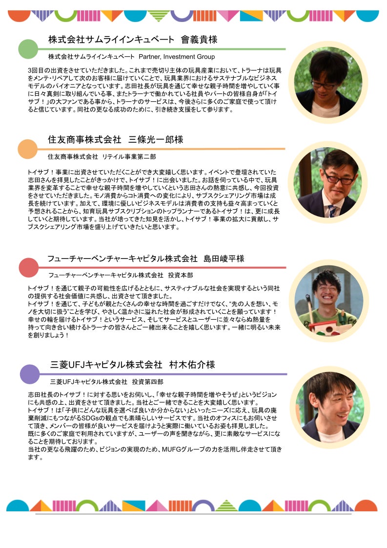 「幸せな親子時間を増やそうぜ」というトラーナのビジョン、「トイサブ!」事業を通して「おもちゃと親子をむすぶ」ミッションの重要性、事業を支えるトラーナチームメンバーの思い、3つ全てに共感頂いた、新たな株主を今回お迎えいたしました。
