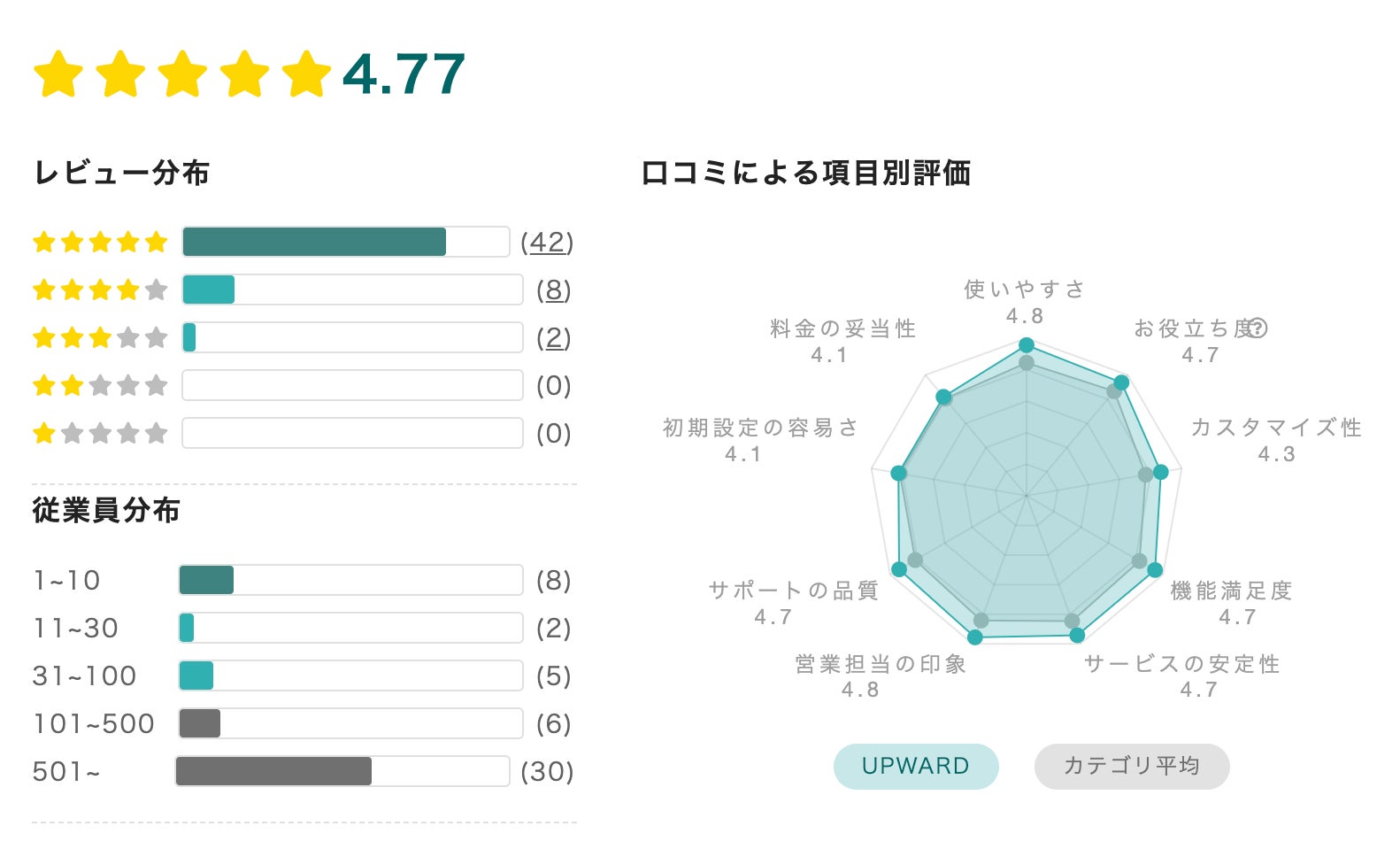 画像引用:スマートキャンプ「BOXIL SaaS」UPWARDの口コミ・評判 ※2022/09/01時点の評価