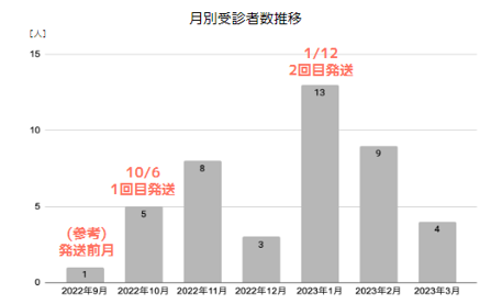 本事業では、骨粗しょう症に関する検査や受診を促すため、勧奨通知の送付を行いました。その結果、通知を送付した2022年10月から2023年3月までに合計42人が医療機関を受診し、受診率は23.33%(42人/180人※)となりました。勧奨通知発送前の9月は受診者が1人であったのに対し、10月は5人、1月は13人に増加する結果が得られました。