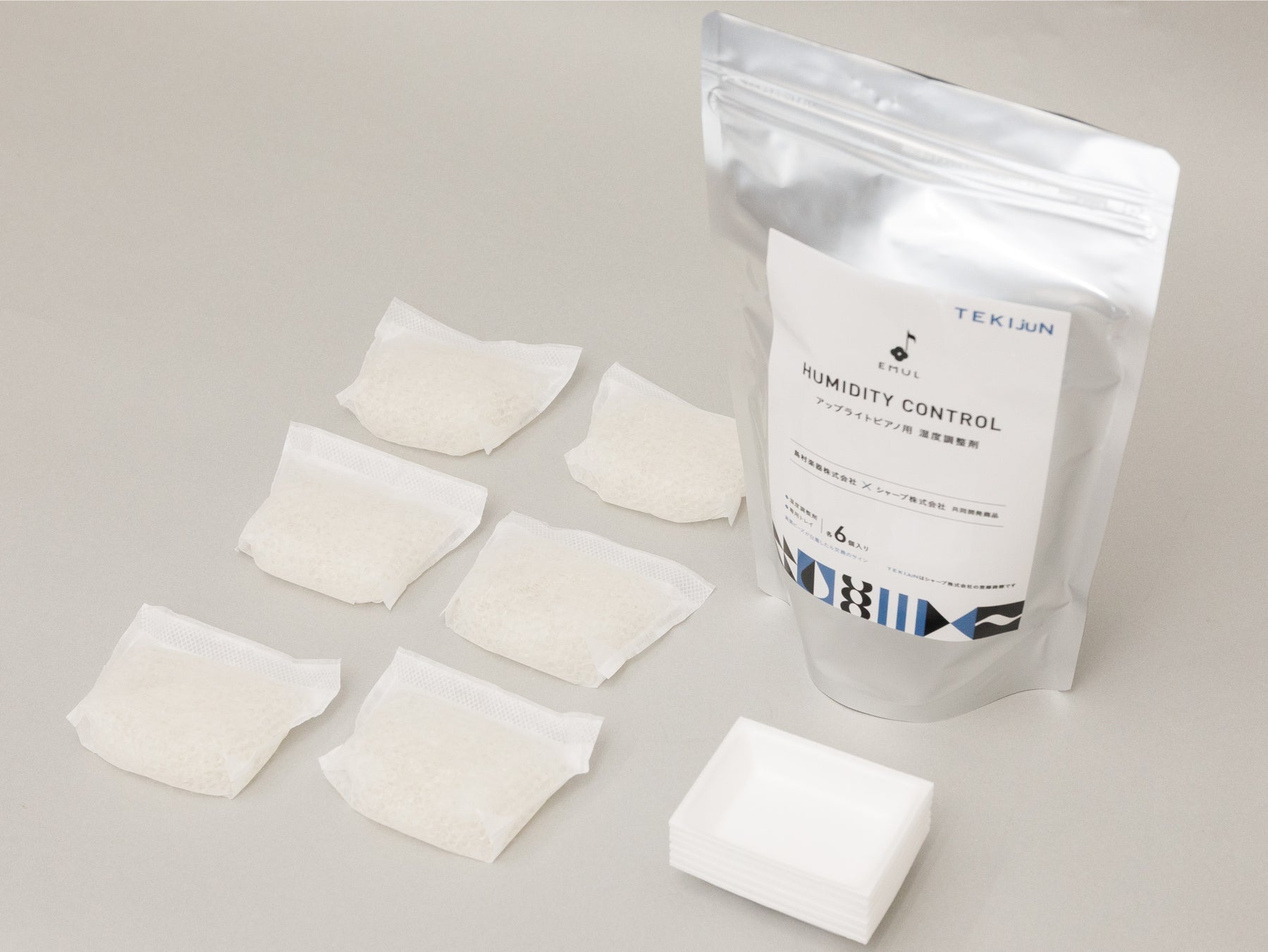 今回発売するEMULでは、ビーズ型TEKIjuNが入った不織布袋を付属のトレイの上に置き、アップライトピアノ内に設置するだけで、TEKIjuNが湿気を吸収または放出し、ピアノ内部の湿度を調節するため、季節を問わず利用可能であり、電源を用意する必要もありません。アップライトピアノ内部を簡単に最適な湿度の状態に保ちます。