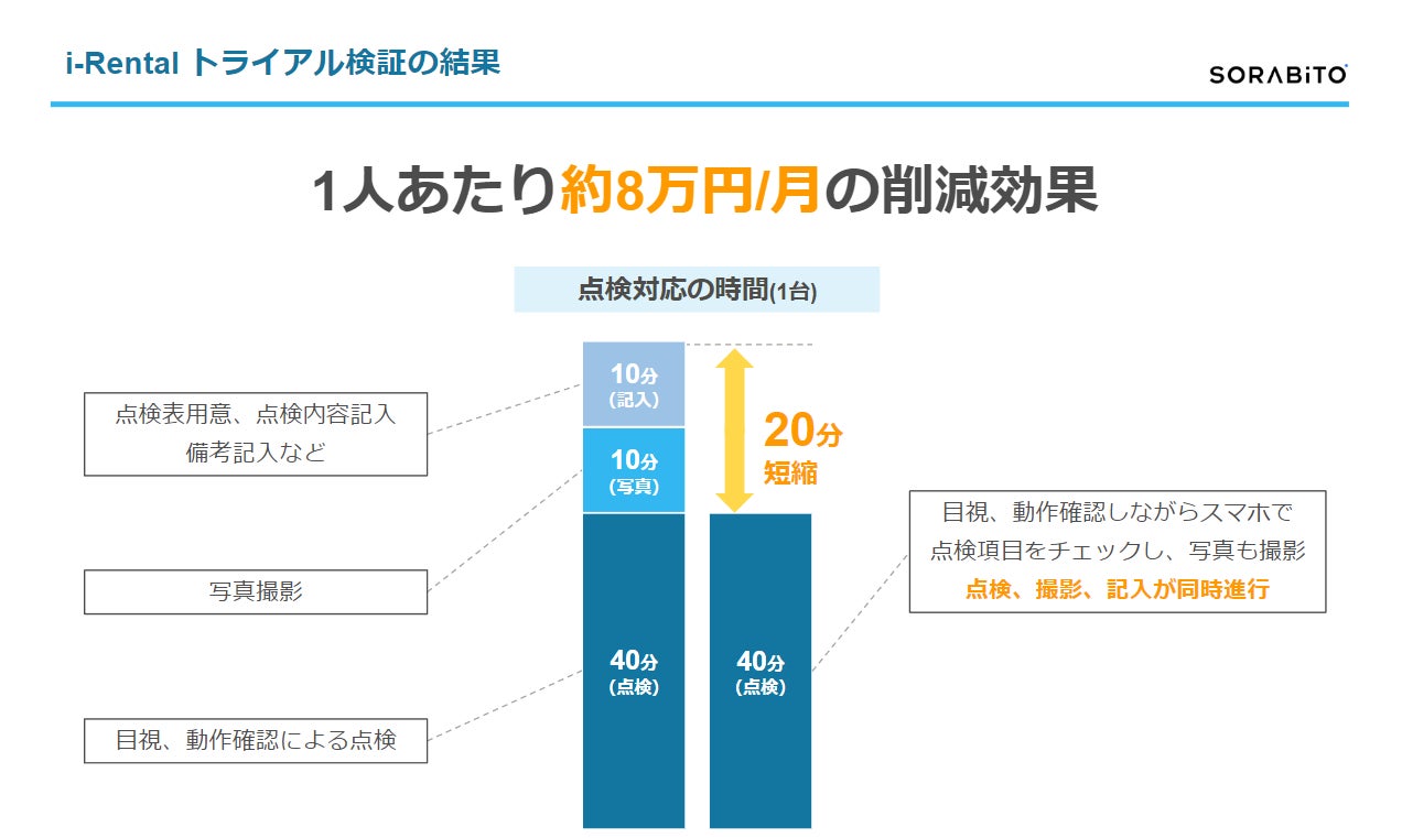 SORABITO株式会社(代表取締役:博多一晃、本社:東京都中央区、以下「SORABITO」)は、建機レンタル事業を福島県内で展開する福島建機株式会社(代表取締役社長:加瀬元三郎、本社:福島県郡山市、以下「福島建機」)で、点検表をペーパーレス化するSaaS型プロダクト「i-Rental 点検」の利用が開始されたことをお知らせいたします。また、無料トライアル利用により得られた業務改善効果についてもあわせてご報告いたします。