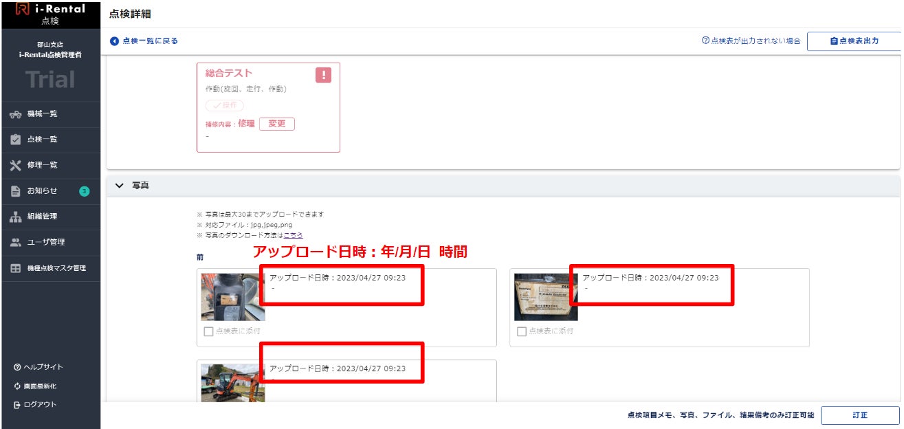 今回のトライアルの結果、建設機械1台当たりの点検業務時間は20分削減され、建設機械整備技能士1人当たりの業務改善効果は約8万円/月とする結果が得られました。また、i-Rental 点検では、スマートフォンやタブレットで撮影した写真を直接サービス上にアップロードすることができますが、その際、アップロード日時も自動登録されます。これにより、検出された傷や故障が建設機械の出庫前から存在していたものか、入庫時に新たに確認されたものかの確認が容易に行えるようになります。この日時データは、印刷した点検表や修理伝票にも対象箇所の写真と共に掲載されることから、有償請求交渉にも有効との評価をいただきました。