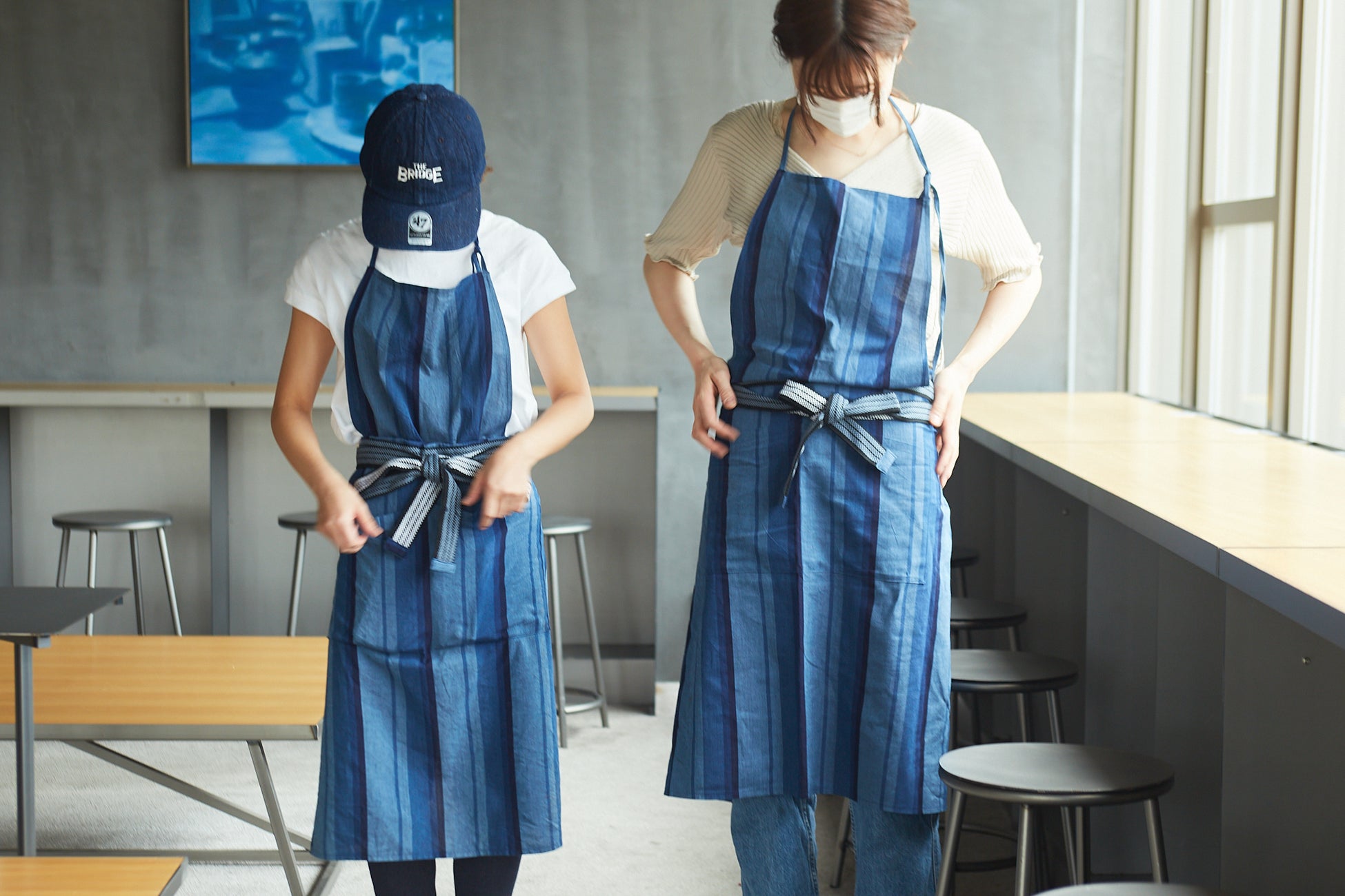 猿田彦珈琲のブランドカラーである猿田彦ブルーをモチーフに特別に生地を織っていただき、生地の幅を変えることで、和の雰囲気もありながらモダンな印象にしました。また、汚れや色落ちがあっても再度染め直して長く使用できる点が環境にも優しいエプロンになりました。エプロンを長く着用できることによって、バリスタという自分たちの仕事にもさらに誇りをもって望めます。