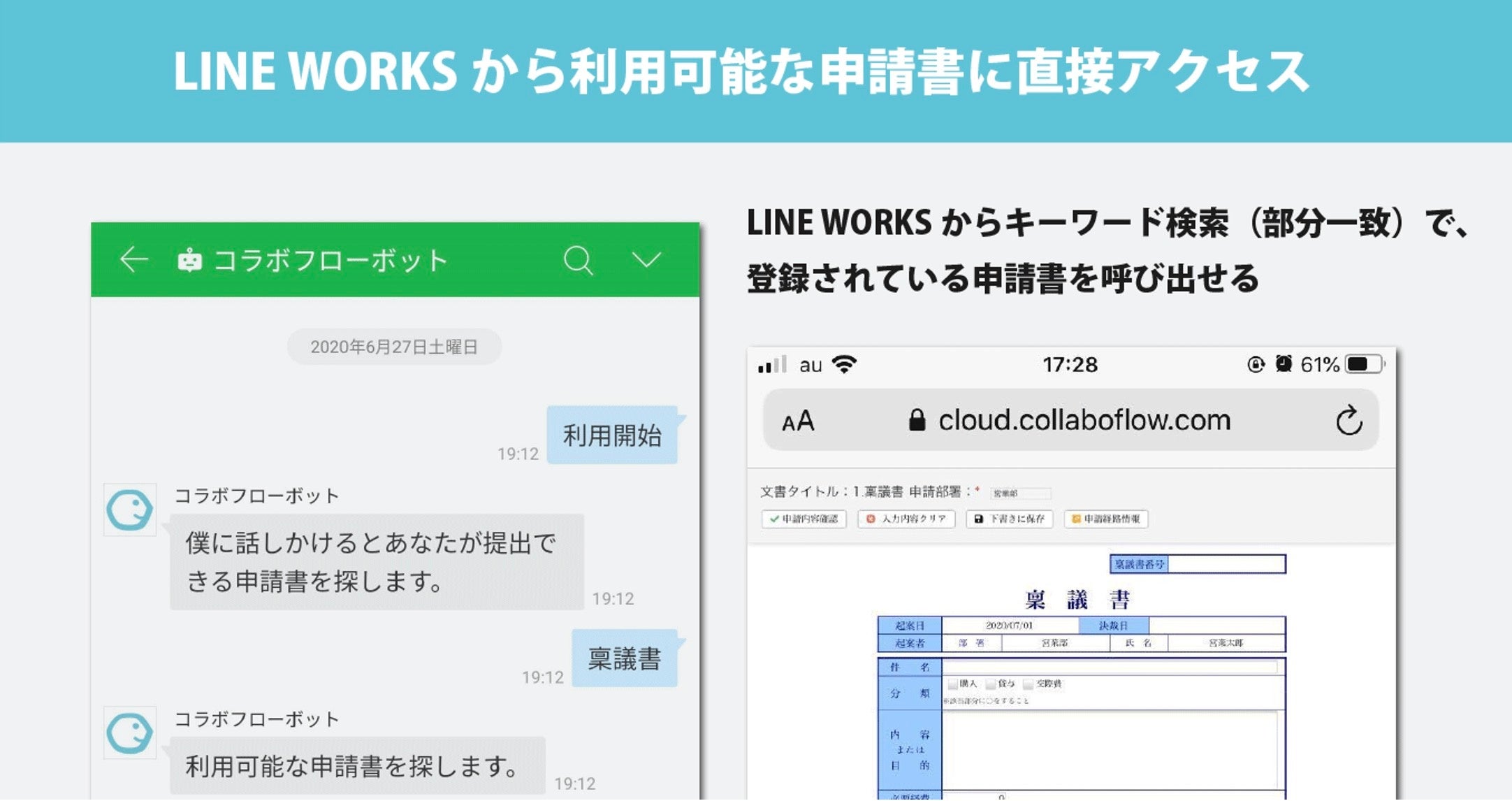 コラボフローとLINE WORKSを連携する「コラボフロー LINE WORKS連携オプション」の利用により、LINE WORKSのトーク上でコラボフローのチャットボットに問いかけることで、コラボフロー内の各種申請書を検索できるようになります。