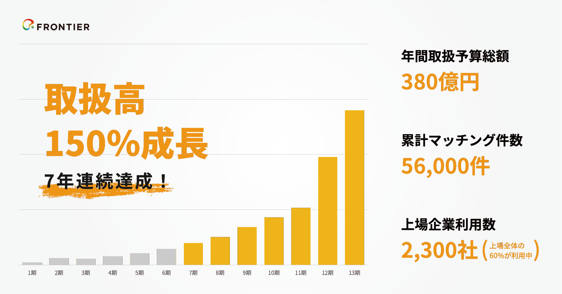 新ビジネスマッチングサービス「Ready Crew(レディくる)」を運営する、フロンティア株式会社(本社:東京都渋谷区、代表取締役:高橋 政裕、以下 当社)は、2022年10月より第14期を迎え、第13期の業績成長率が前期(第12期)比150%、取扱予算総額380億円、上場企業利用数は上場企業全体の60%にあたる2,300社を突破したことをお知らせいたします。