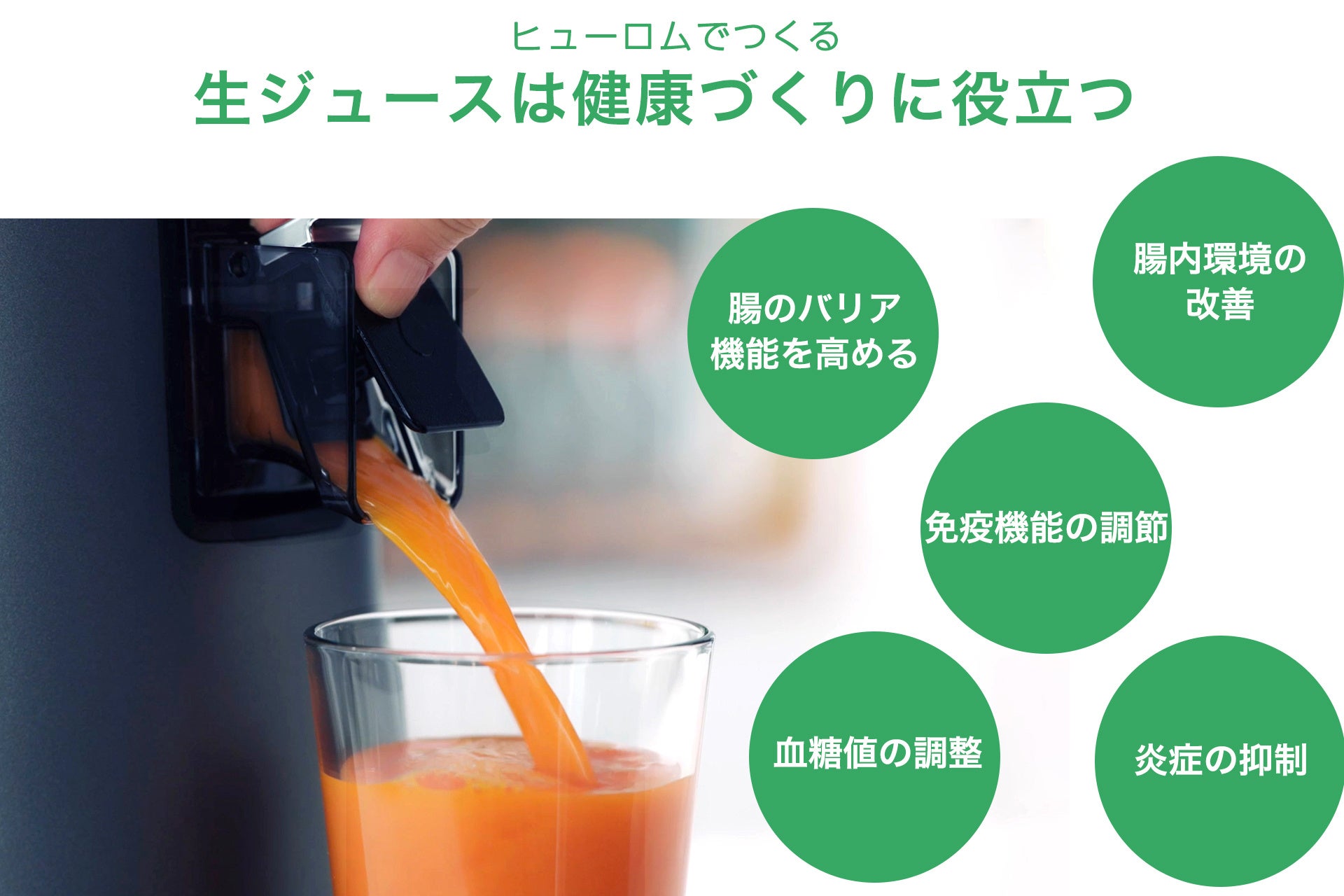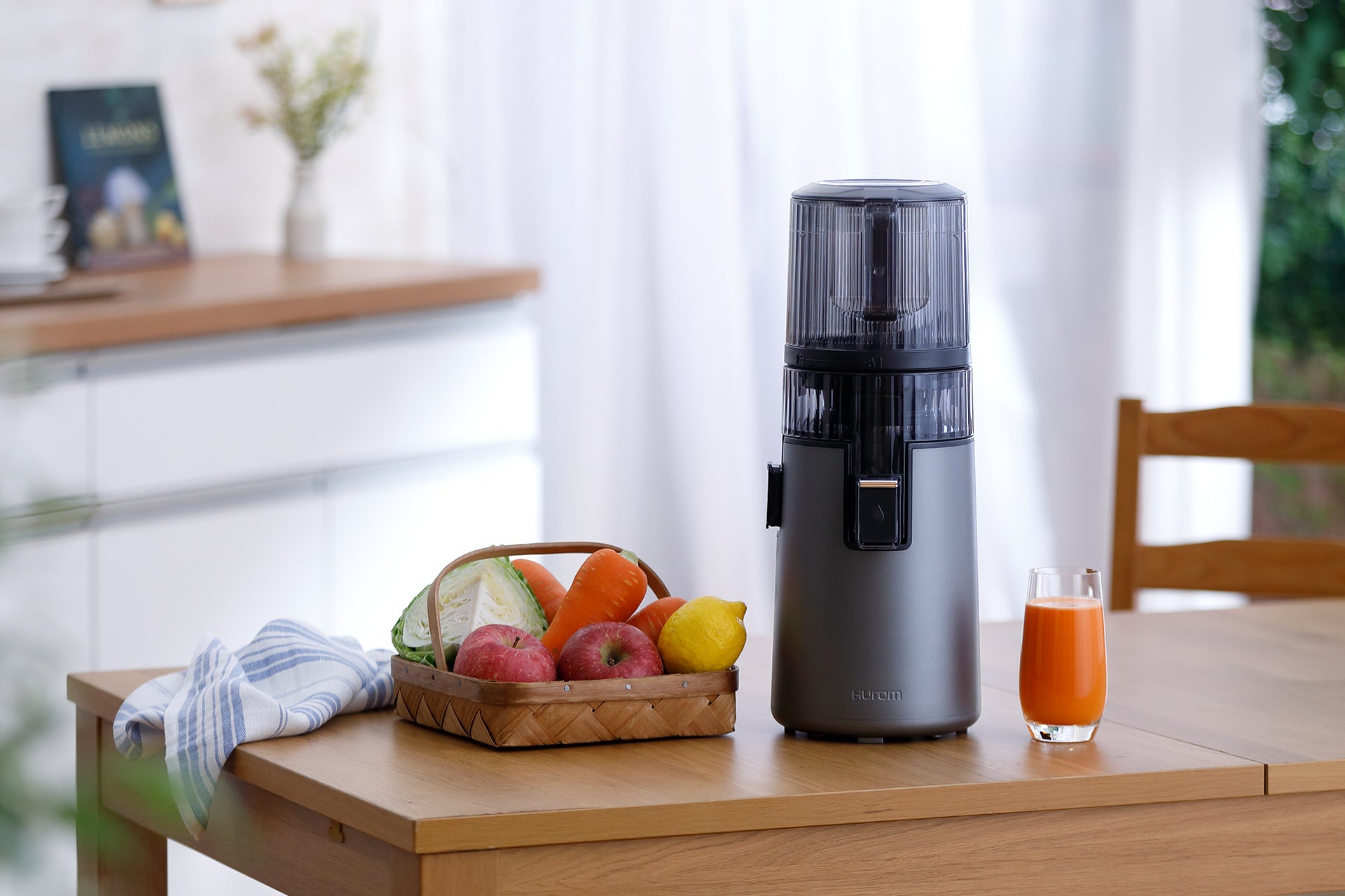 ヒューロムのスロージューサーは、シンプルで無駄のないスリムなデザインに、独自技術による高い搾汁機能を搭載しています。食材をすり潰すようにゆっくりと搾汁するため、熱に弱い栄養素や酵素も損なわれません。