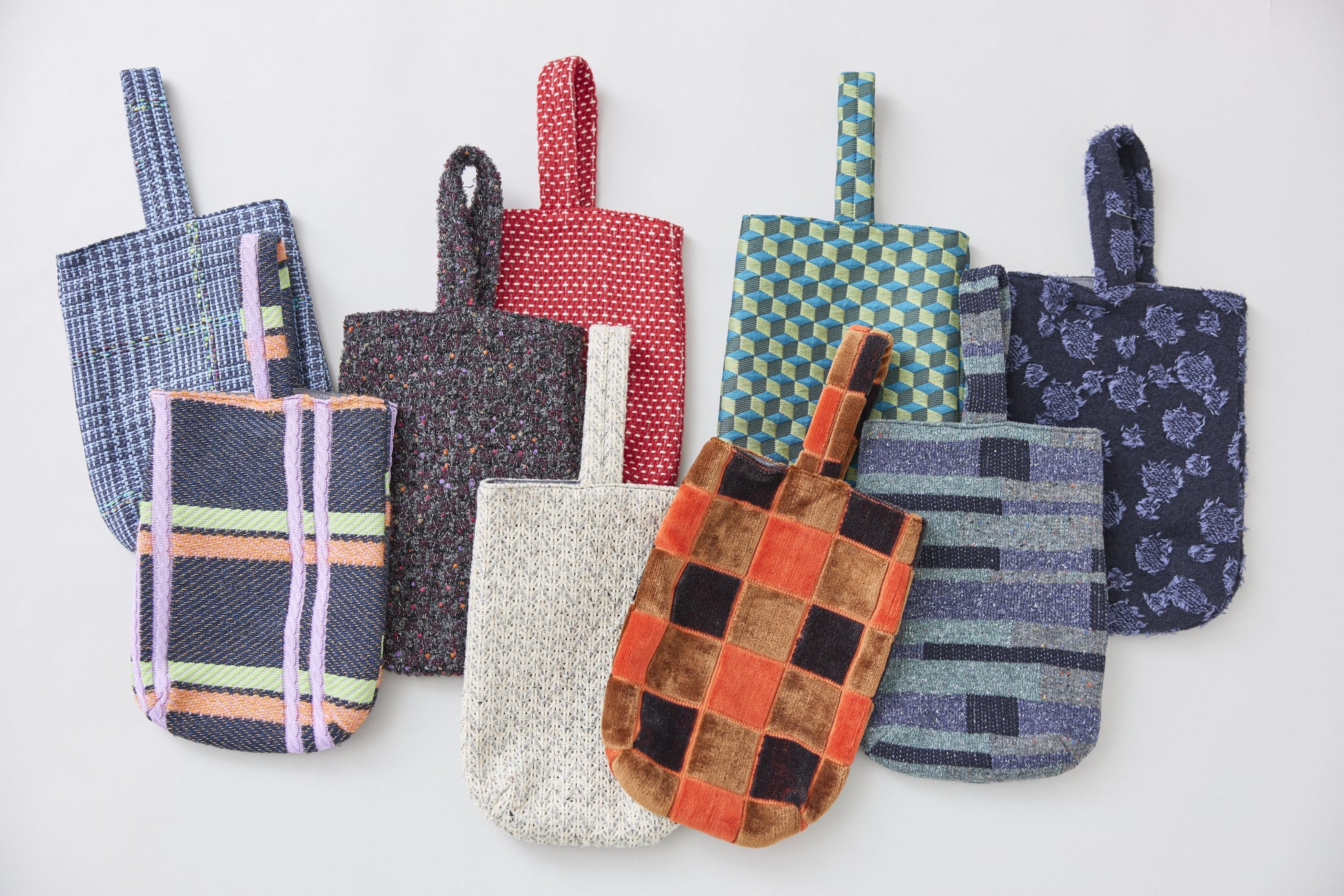 テキスタイルメーカーの倉庫に眠る残布を使った、一つひとつ表情が異なるバッグを数量限定で販売します。1点4,950円(税込)