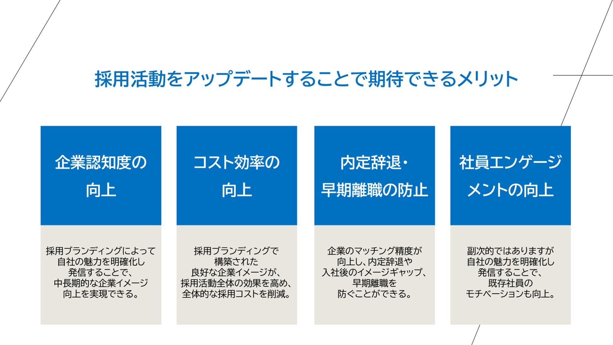 このような変化に対応するため、企業は単なる採用広報にとどまらず、企業全体の魅力を戦略的に発信する「採用ブランディング」の視点を取り入れることが、採用力向上には不可欠になってきます。