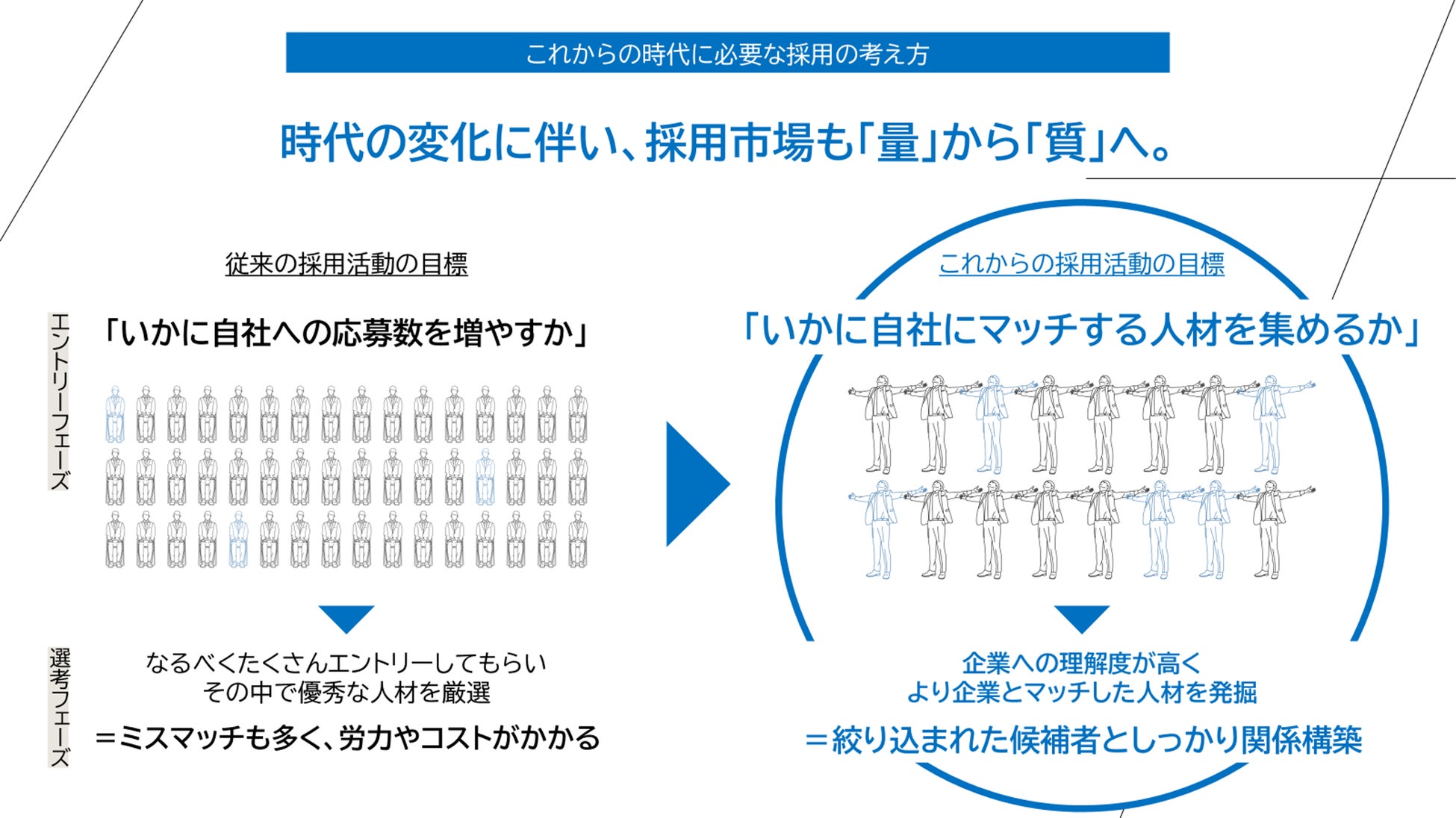 少子化による人材不足に加え、「タイパ(タイムパフォーマンス)」を重視する学生の増加により、母集団形成はますます困難に。加えて、内定辞退や早期離職といった課題も深刻化しています。