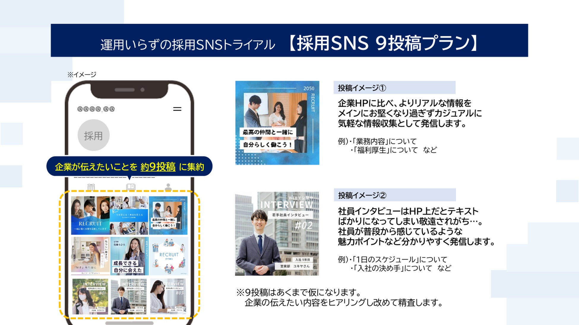 SNS運用に不安を感じる企業に向けた、設置型で運用不要のトライアルプランです。このプランでは、就活生がいつ訪れても自社の強みを伝えられるよう、9つの投稿コンテンツに魅力を凝縮して設置します。その反響を踏まえて今後の運用を続けるかどうかを検討できる実践的なプランです。