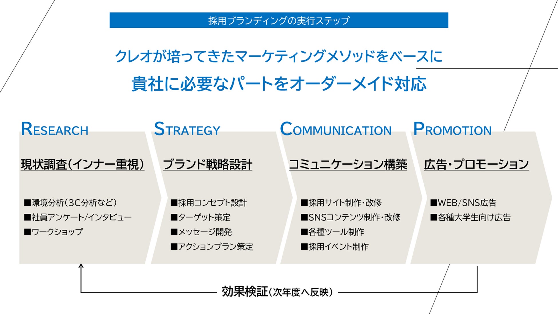 クレオ独自のマーケティングメソッドを活用し、生活者インサイトに基づいたデータを駆使して企業の採用活動を支援いたします。戦略立案から実行に至るまで、すべてのプロセスをサポートすることで、採用ブランディングを総合的に強化し、成果へと繋げます。