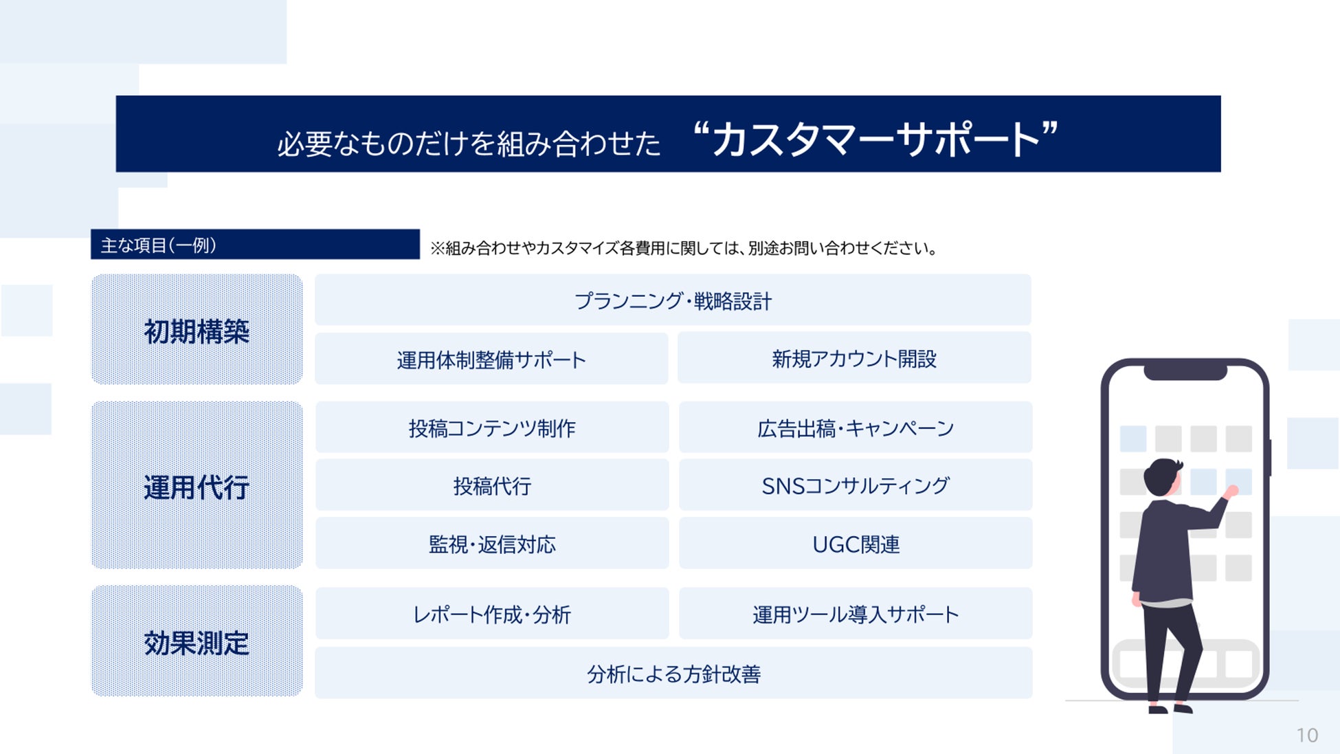 企業が自社内でSNSを運用する際に「何が必要なのか、何が欠けているのか」を洗い出して支援を行うプランです。必要な部分だけを利用可能なカスタマイズ型サービスで、余計なコストをかけずに効率的なSNS運用が可能です。例えば、「初期構築のみ」や「分析業務のみ」など、ニーズに応じた柔軟なサポートをご選択いただけます。