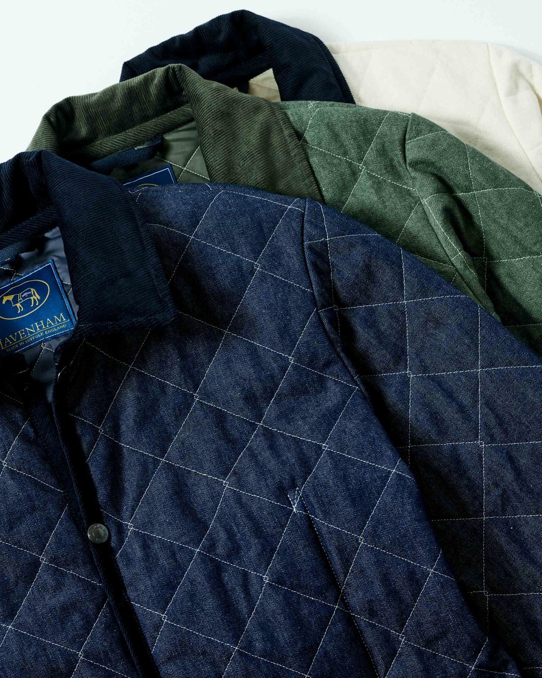 このプロジェクトでは、ラベンハムのクラシックスシリーズ「Denham(デンハム)」を、90年代のヒップホップ界で流行したワークウェアジャケットを参考に、3色の日本製デニム生地にキルティングを施しました。元々は乗馬の際に着用するためにデザインされた、ラベンハムのクラシックなジャケット「デンハム」を再解釈しています。