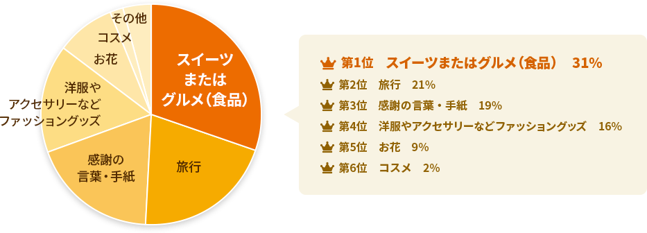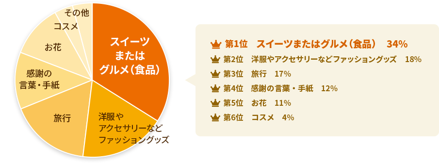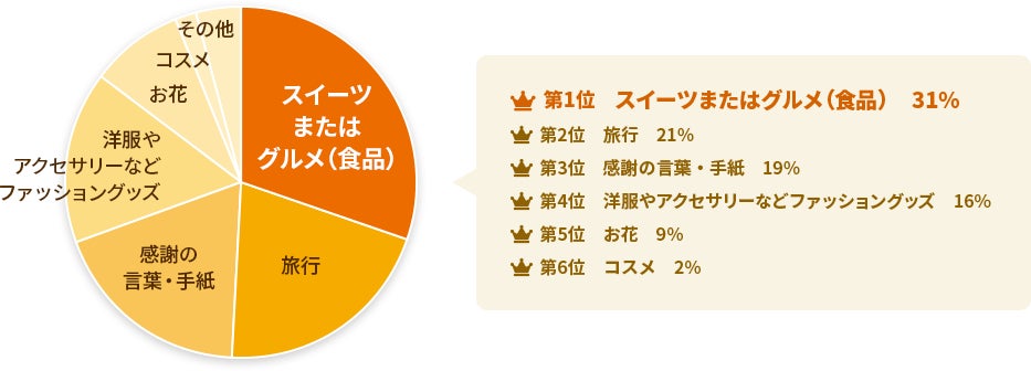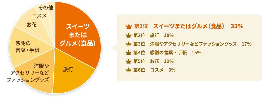 ・1位が「スイーツまたはグルメなどの食品」で33%、2位~5位は「旅行」「洋服やアクセサリー」「感謝の言葉・手紙」「お花」