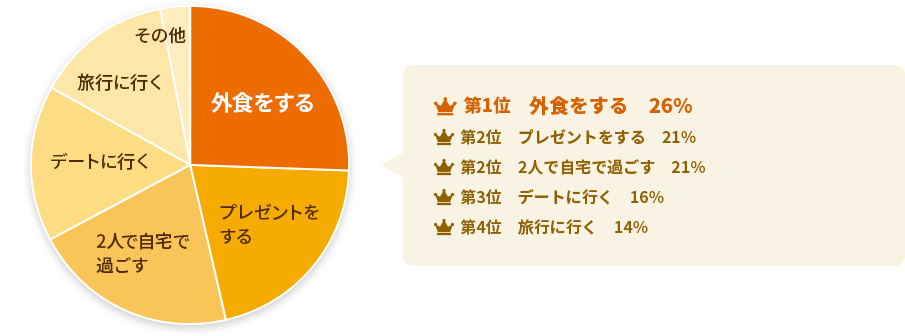 1位が「外食に行く」で26%、2位は同率で「プレゼントをする」・「2人で自宅で過ごす」という回答が21%でした。