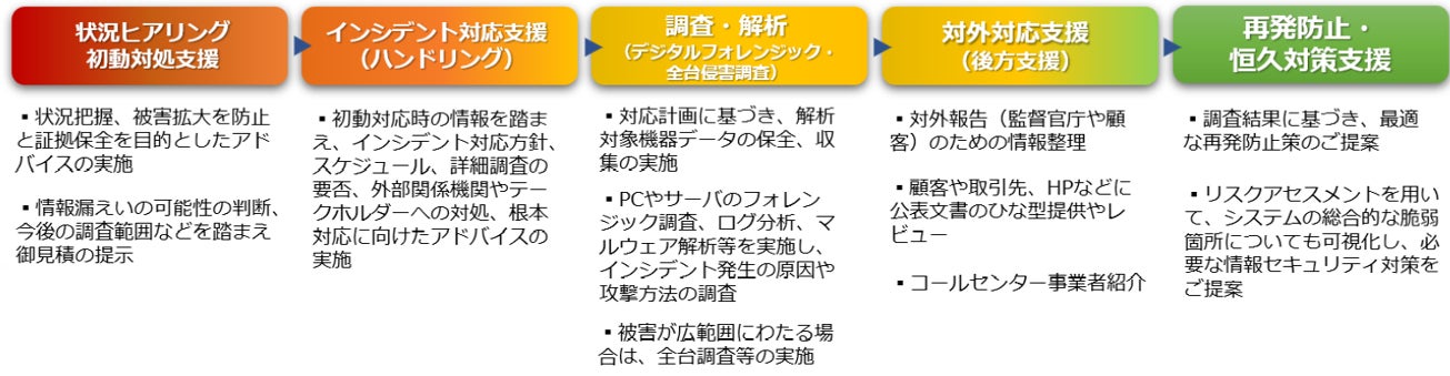 セキュリティ専門家による初動対応支援から、調査・解析(デジタルフォレンジック)、外部関係者(顧客・取引先・監督官庁等)対応の支援、再発防止・恒久対策支援までの全フェーズをカバー。