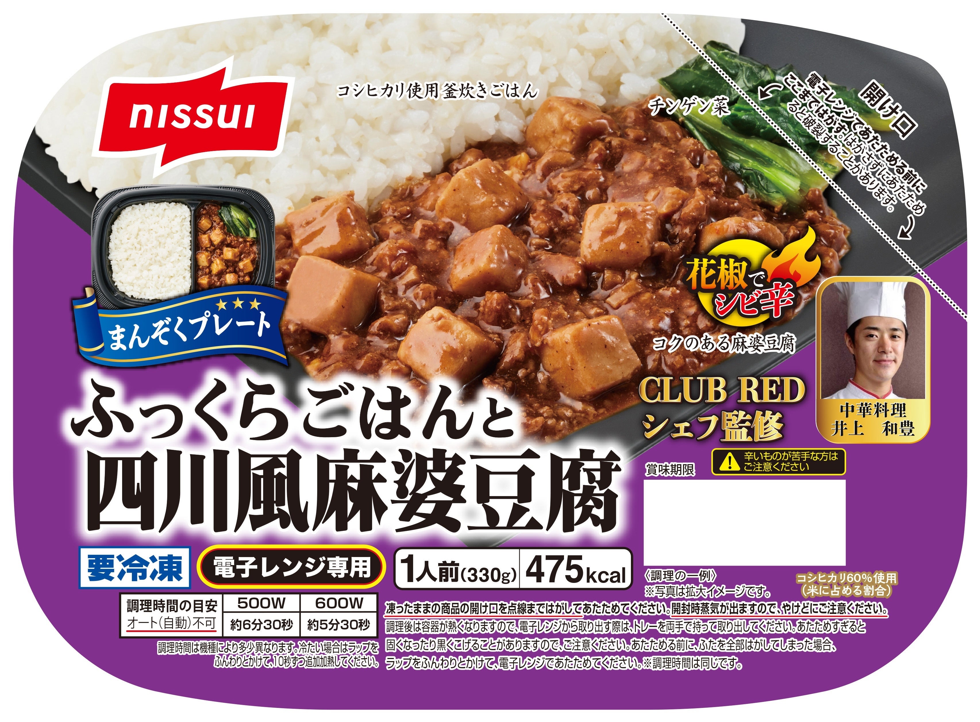 商品特徴 | ・CLUB RED(※1) 井上和豊シェフ(※2)が監修しています。 ・ごはんはコシヒカリをブレンドした米を釜炊きして、ふっくら仕上げました。 ・甜面醤・豆鼓醤・豆板醤の3種の醤を使用し、 辛味と花椒の香りを引き立てた四川風麻婆豆腐を主菜としました。 ・副菜にはゆでたチンゲン菜を添えています。 ・白飯とおかずが混ざらないよう、トレーの形状を工夫しました。 ・トップフィルムを指定の位置まではがし、 トレーごと電子レンジで加熱するだけで召しあがれます。 ・トレーの10%に植物由来素材を使用しています。 ・外装のインキの10%に植物由来原料を使用しています。 |