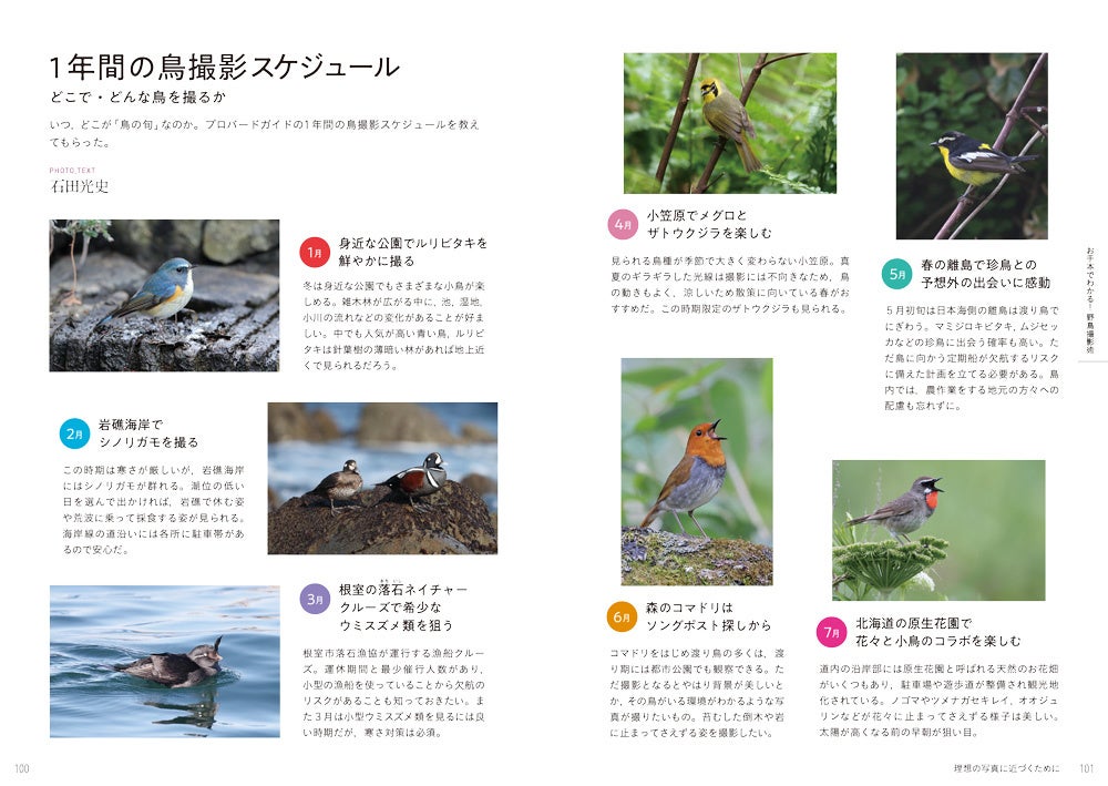 さらに、1年間の撮影スケジュールのモデルケースや、日本全国のおすすめ探鳥地なども掲載。この本があればカメラの設定から探鳥地の策定まで、野鳥撮影の初心者が知っておきたい情報がすべてわかります。