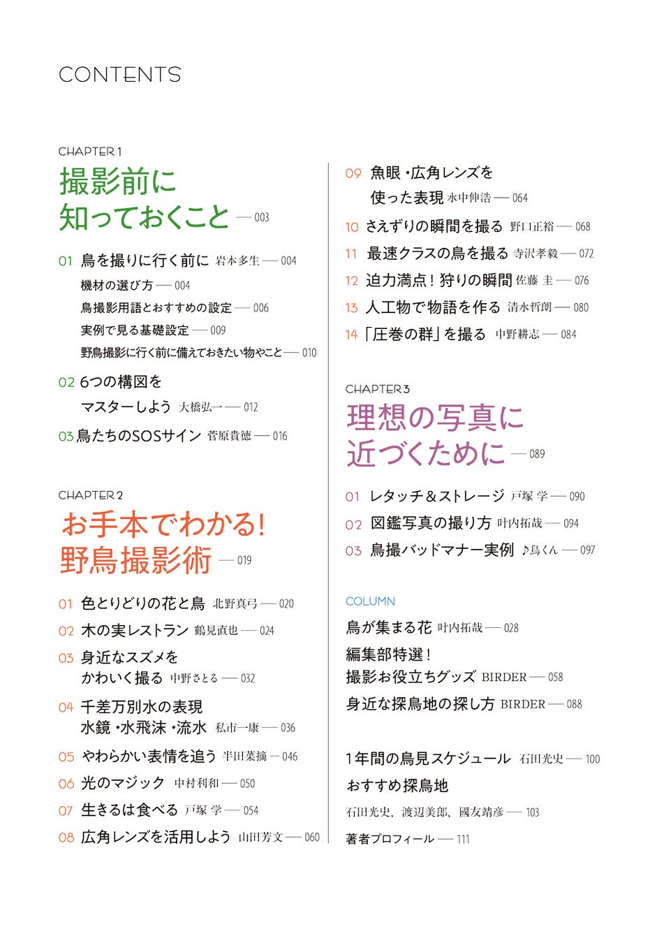 「お手本にしたい野鳥写真」をテーマにした、野鳥撮影のコツやテクニックを解説する指南書です。花と鳥を絡めるならどんな時期がよいのか、流れる水を撮るにはどのような設定が必要なのか、身近なスズメを撮るコツは?といった、比較的取り入れやすい作風やテクニックから、飛翔や狩りの瞬間、スピーディーで難しい瞬間まで、幅広く網羅しています。