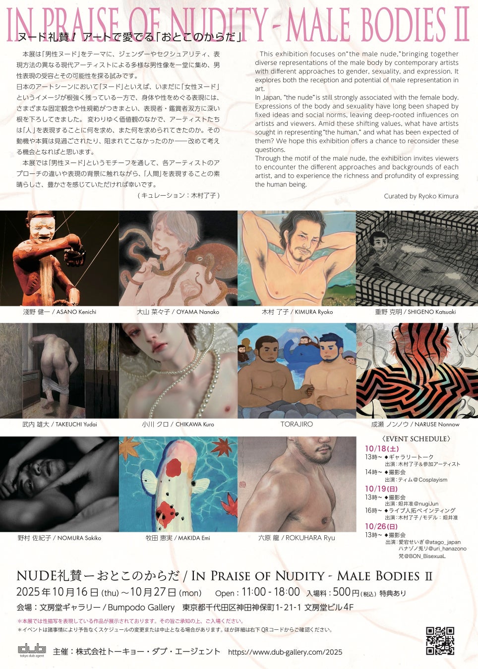 2022年、第1回目が開催され、多くの入場者と反響をいただきましたNUDE礼賛!「おとこのからだ」展が3年ぶりに新たなアーティストを迎え開催されます。今回もイケメン画家の木村了子さんがキュレーションを行い写真、絵画、彫刻等様々な手法によりおとこのからだを表現します。また、ご来場者の方々が気軽に参加できる男性モデルの撮影会等のイベントも予定しています。