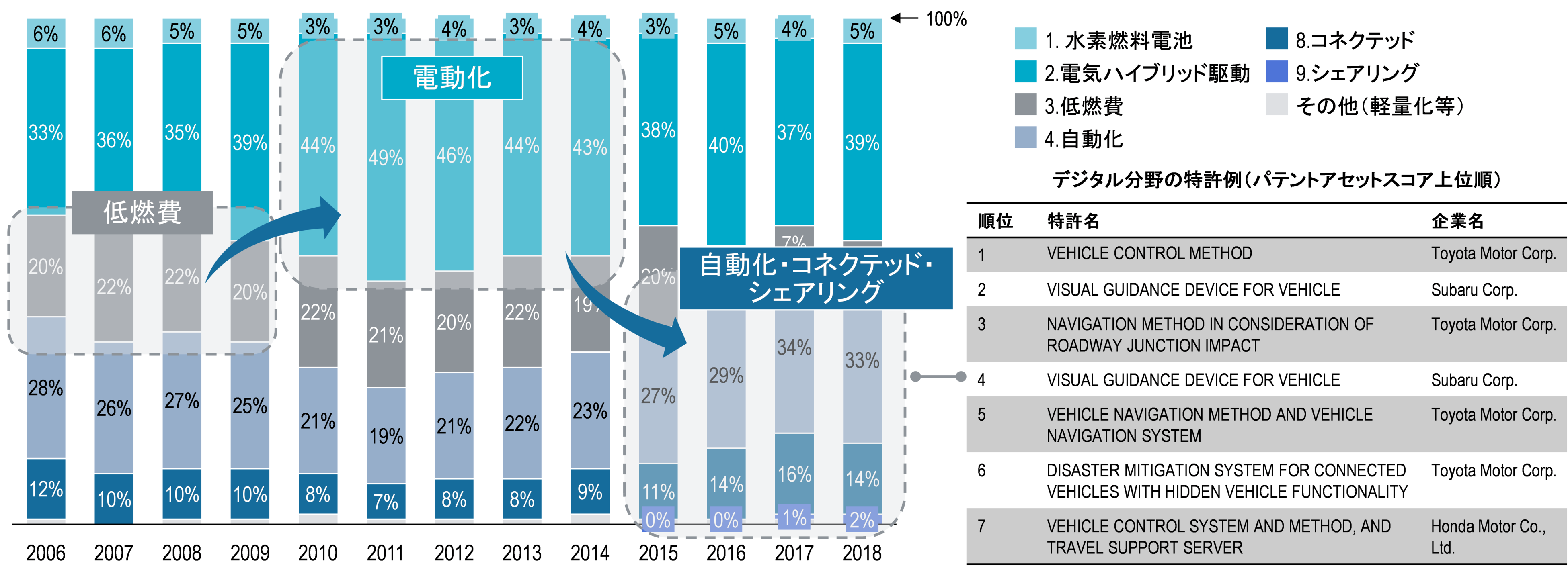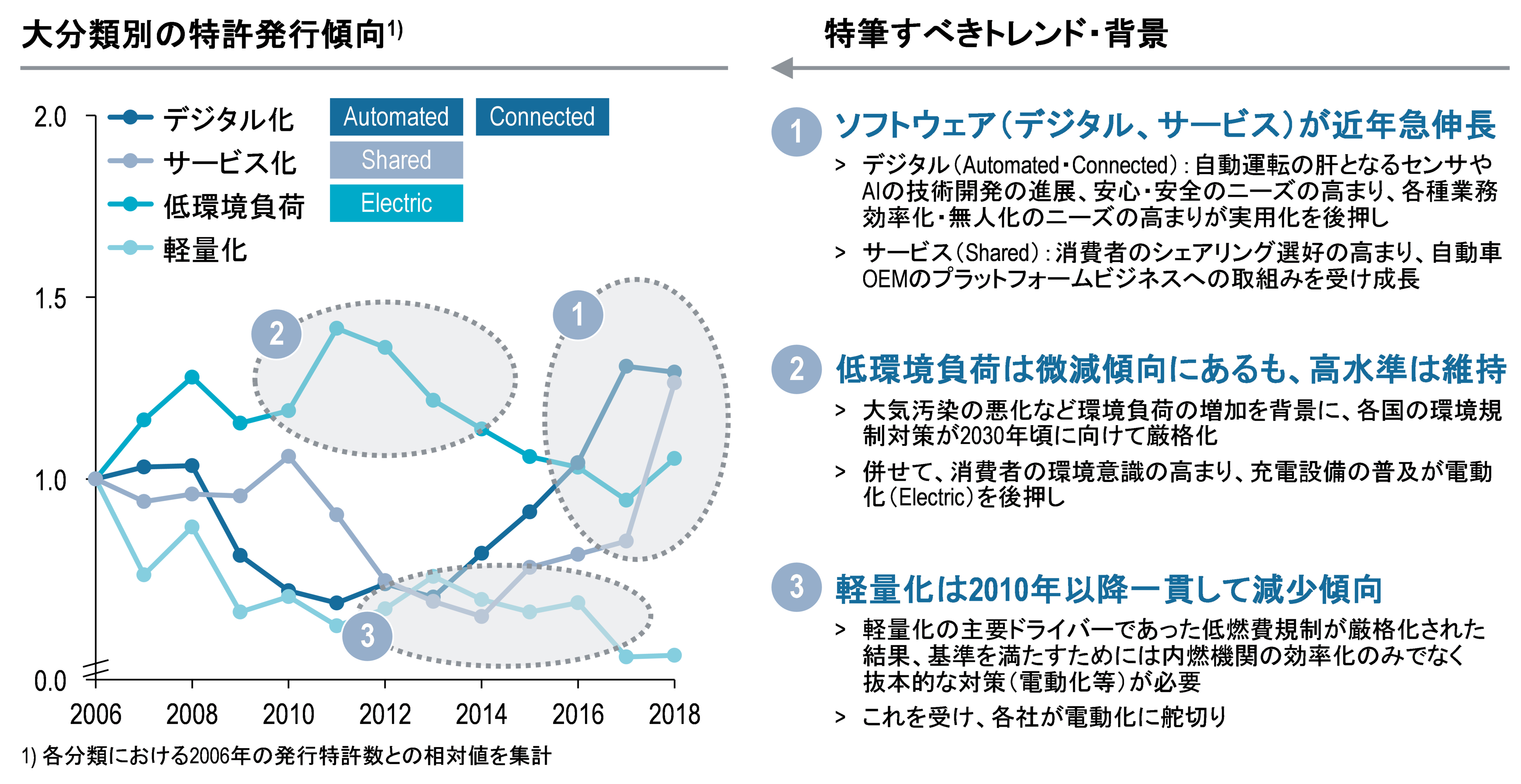 これら各特許のカテゴリをモビリティ業界の4大トレンドCASEに照らすと、Automated/Connectedは「デジタル化」、Sharedは「サービス化」、Electricは「低環境負荷」にそれぞれ対応する。