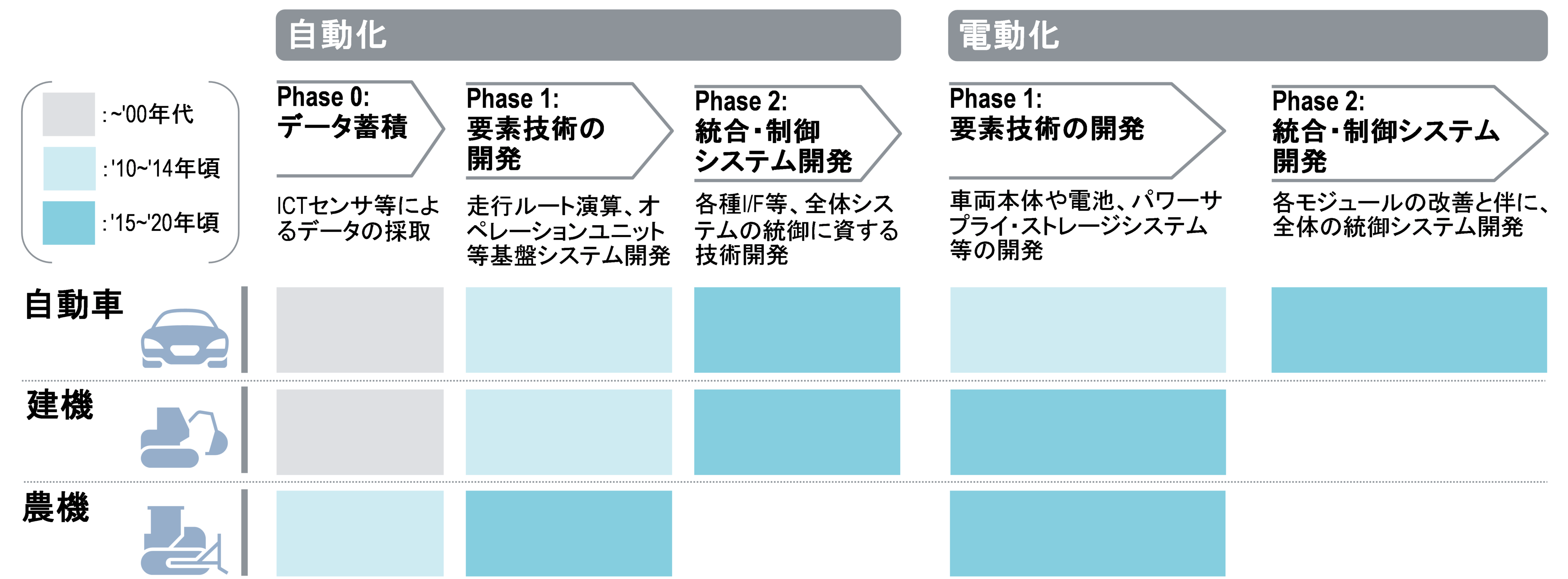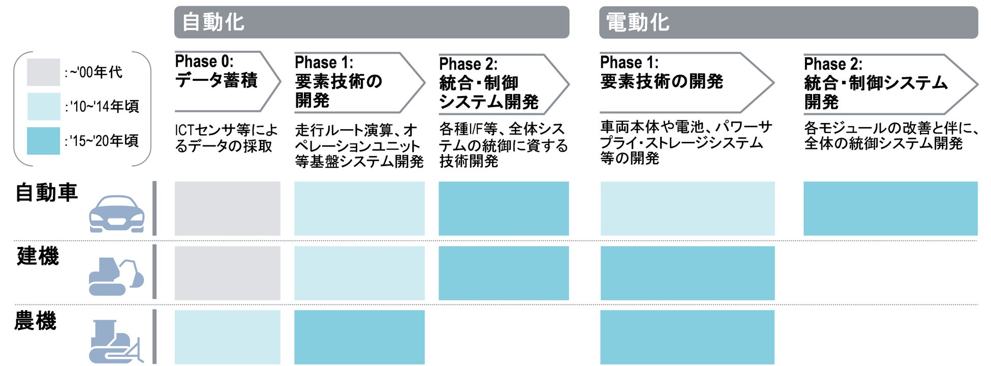 の順に進む。この中で、建機・農機は、分野により自動車を追従する形でのその技術開発が進んでいく傾向が見て取れる。農機・建機の技術開発トレンドの詳細については、次章以降で分析していく。