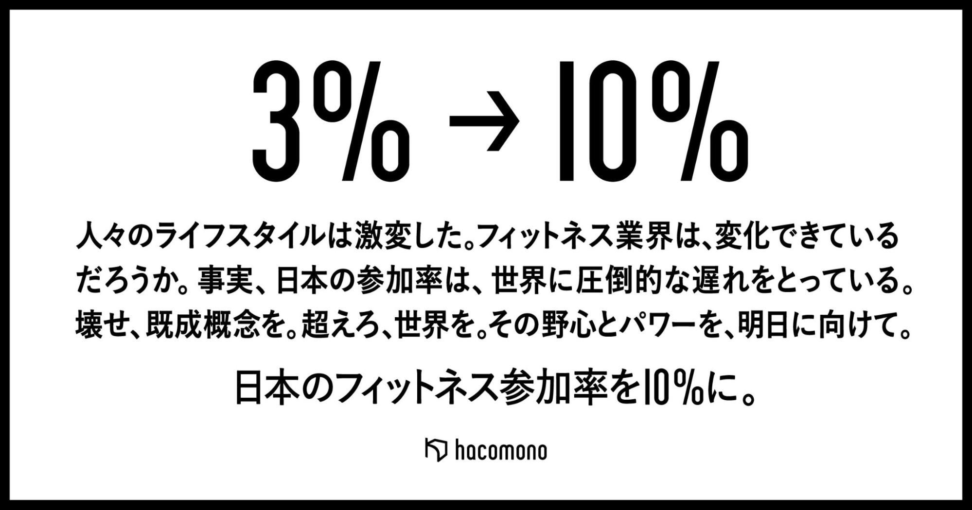 「ウェルネス産業を、新次元へ。」のビジョンを元に、心身ともに充実した人を、ひとりでも増やすことを目的に、日本のフィットネス参加率を推進する「PROJECT 3%→10%」を立ち上げることにいたしました。