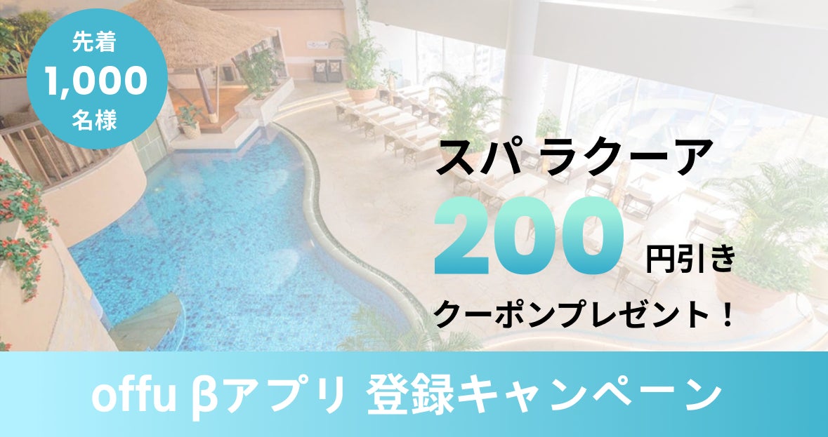 「offu」webアプリにご登録頂いた方のうち、先着1,000名様にスパ ラクーアのご精算時に使える200円割引クーポンをプレゼント!この機会に是非「offu」webアプリにご登録下さい。