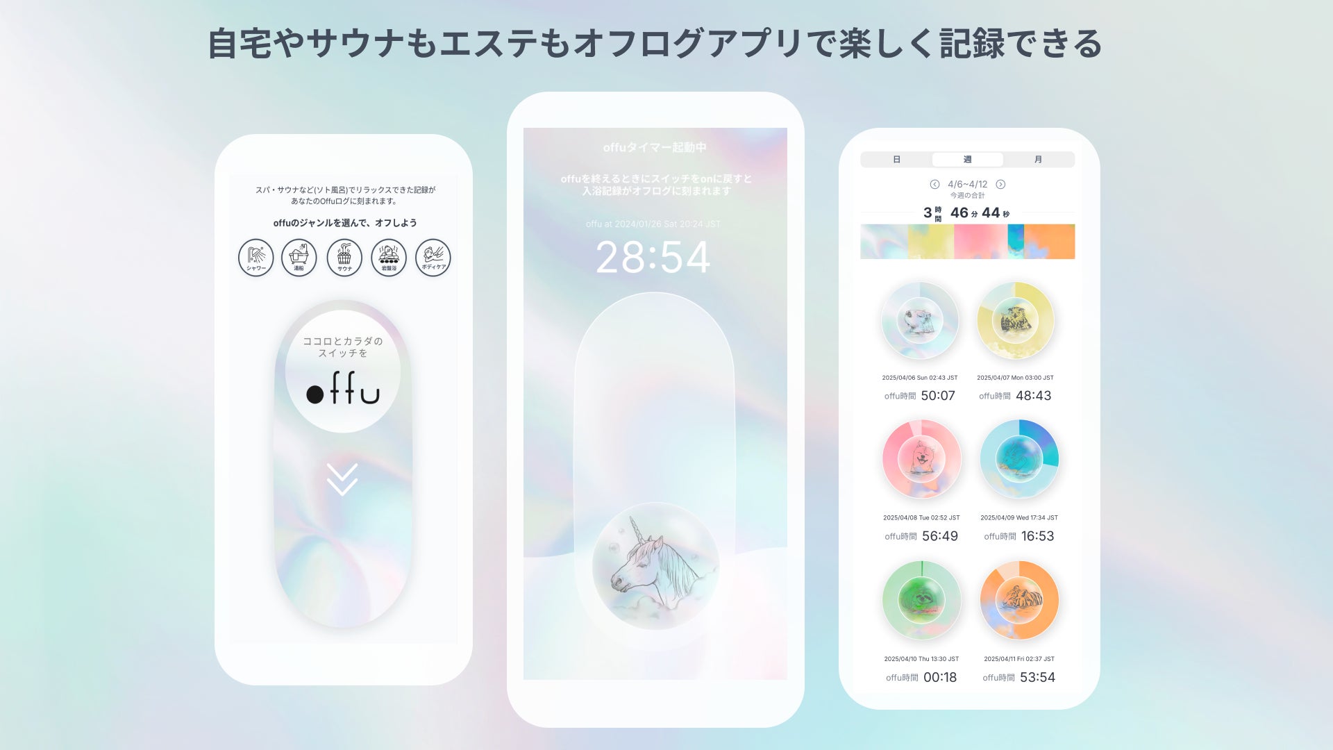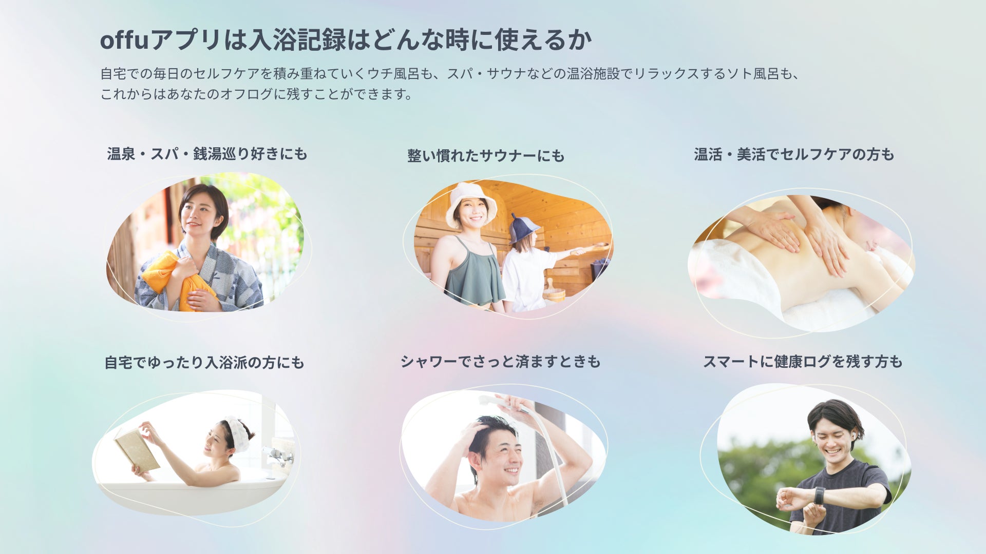 自宅での毎日のセルフケアを積み重ねていくウチ風呂も、スパ・サウナなどの温浴施設でリラックスするソト風呂も、これからはあなたのオフログに残すことができます。