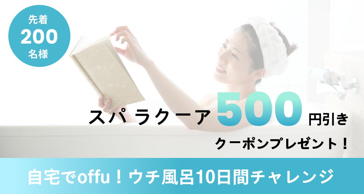 ご自宅での入浴時に「offu」webアプリを使い「ウチ風呂」の入浴証明書を10日間分集めると、先着200名様にスパ ラクーアのご精算時に使える500円割引クーポンをプレゼントします。