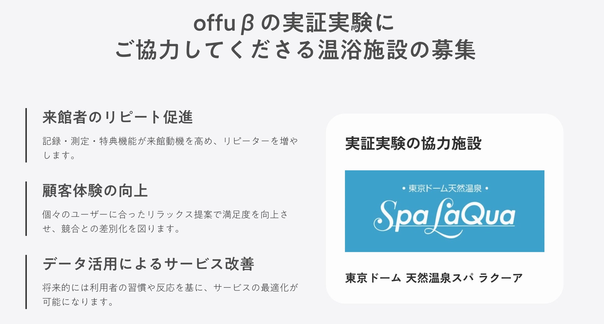 2025年5月から7月にかけて、スパ ラクーアにて「offu」 webアプリを活用した施設導入の実証実験を実施します。期間中はoffu βwebアプリを通じ、入浴履歴に基づく「入浴証明書」を提示することで特典クーポンを受けられるキャンペーンも予定されています。