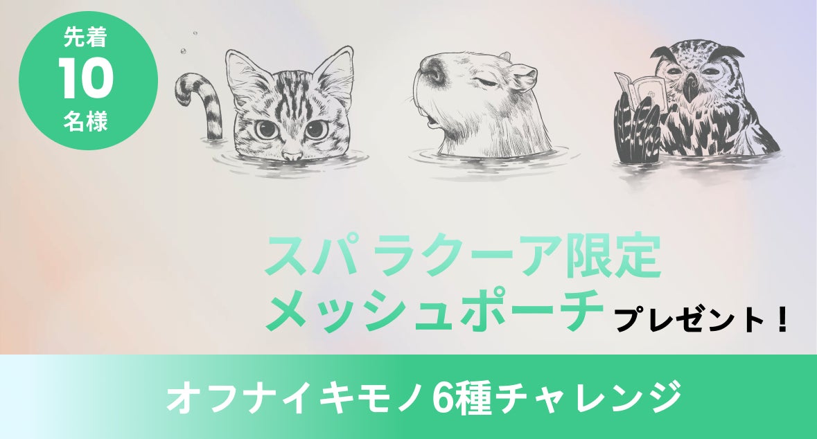 入浴証明書を取得するたびにランダムで「オフナイキモノ」バッジが取得できます。全16種の「オフナイキモノ」のうち6種を集めると、先着10名様にスパ ラクーア「メッシュポーチ」をプレゼントします。