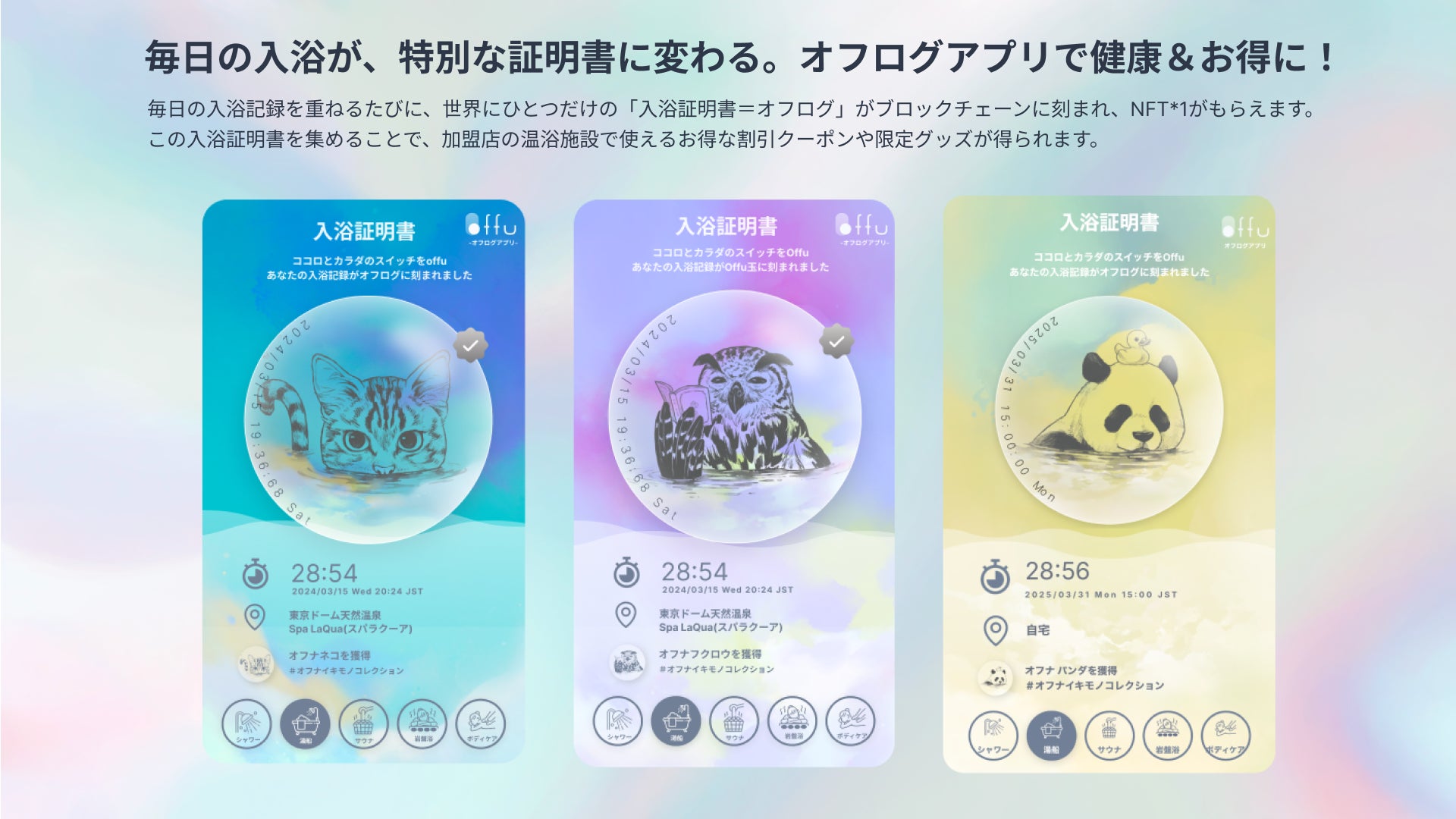 毎日の入浴記録を重ねるたびに、世界にひとつだけの「入浴証明書=オフログ」がブロックチェーンに刻まれ、NFT*1がもらえます。この入浴証明書を集めることで、加盟店の温浴施設で使えるお得な割引クーポンや限定グッズが得られます。