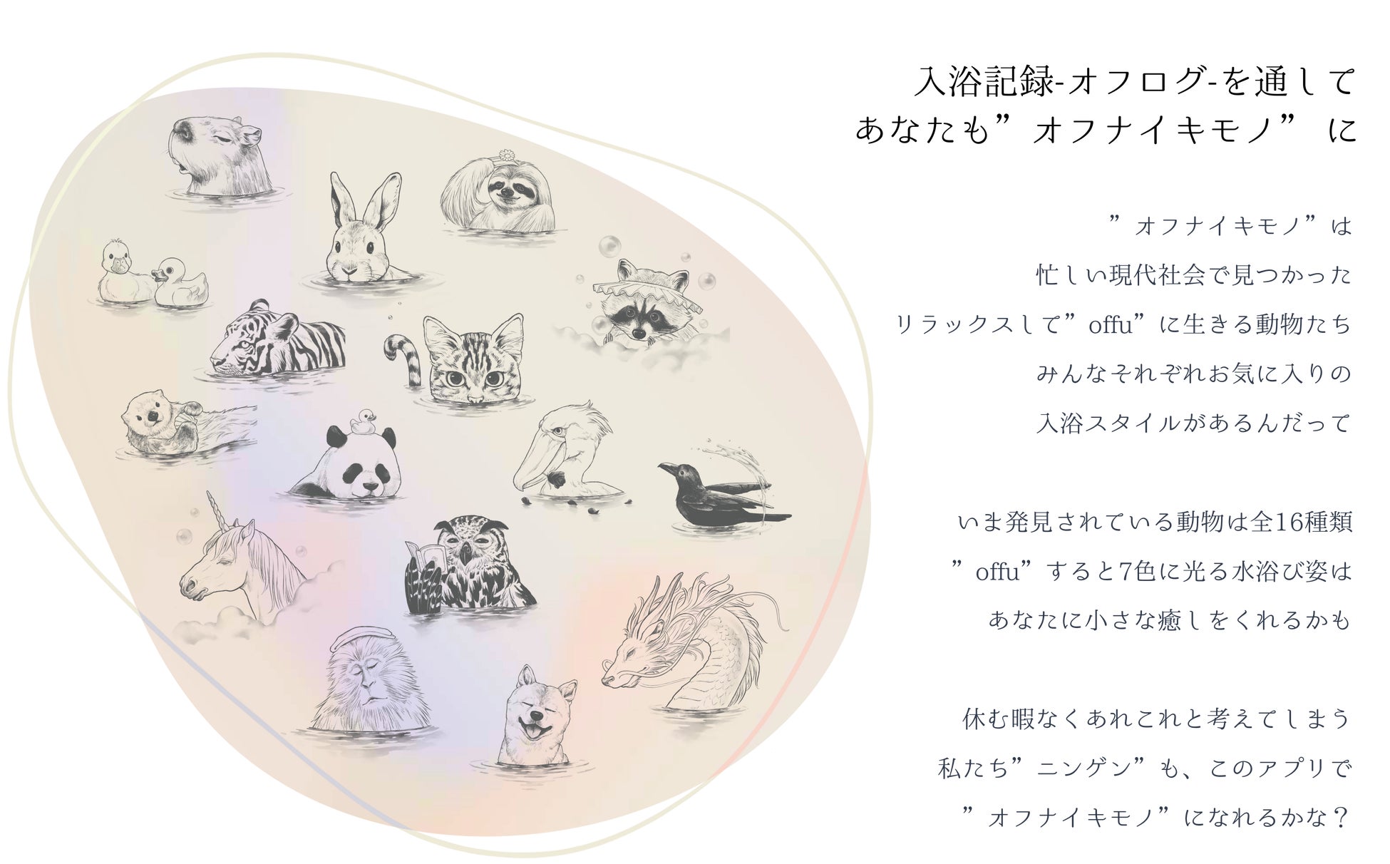日々忙しく、休む暇もなくあれこれと考えて動いてしまう私たち ”ニンゲン” も、心をやすめて ”オフナイキモノ” のようにリラックスできるよう、offuアプリがサポートします。