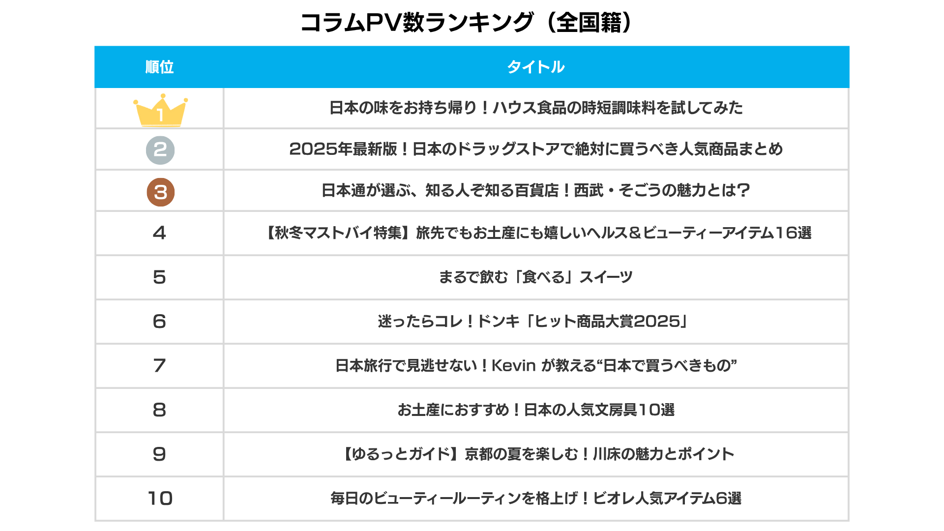 なかでも1位となった「日本の味をお持ち帰り!ハウス食品の時短調味料を試してみた」は、スーパーで購入できる身近な商品でありながら、本格的な日本の味を再現できる点が評価されたと考えられます。帰国後も日本の食卓を手軽に楽しみたいという、訪日客の新たなニーズが表れた結果となりました。以下は、2025年9月に最も読まれたコラムTop10です。