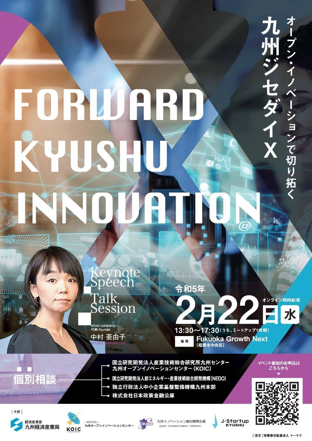 経済産業省 九州経済産業局が主催する『FORWARD KYUSHU INNOVATION』は、九州地域のイノベーション創出を促進することを目的に、大企業だけではなく中堅・中小企業やスタートアップ、大学、金融機関等の参加者とともに、その成功の“鍵”と、オープン・イノベーションで切り拓く九州の“未来”について、会場の皆様とともに考えるイベントです。