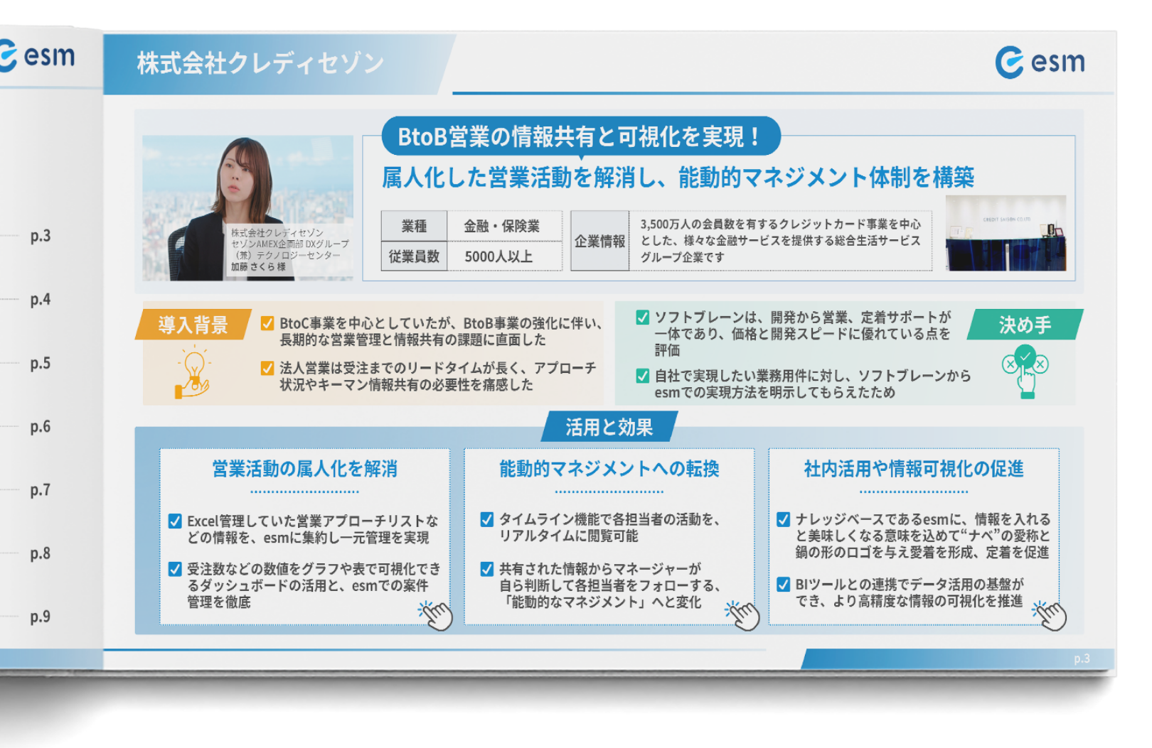 企業競争力向上のためのCRMであるesm(eセールスマネージャー)を提供するソフトブレーン株式会社(本社:東京都中央区、代表取締役社長:豊田浩文、以下「ソフトブレーン」)は、「業種・企業規模別に『営業の改革』を描く!esm(eセールスマネージャー)導入事例集」と題した7社の導入事例集を無料で公開しました。