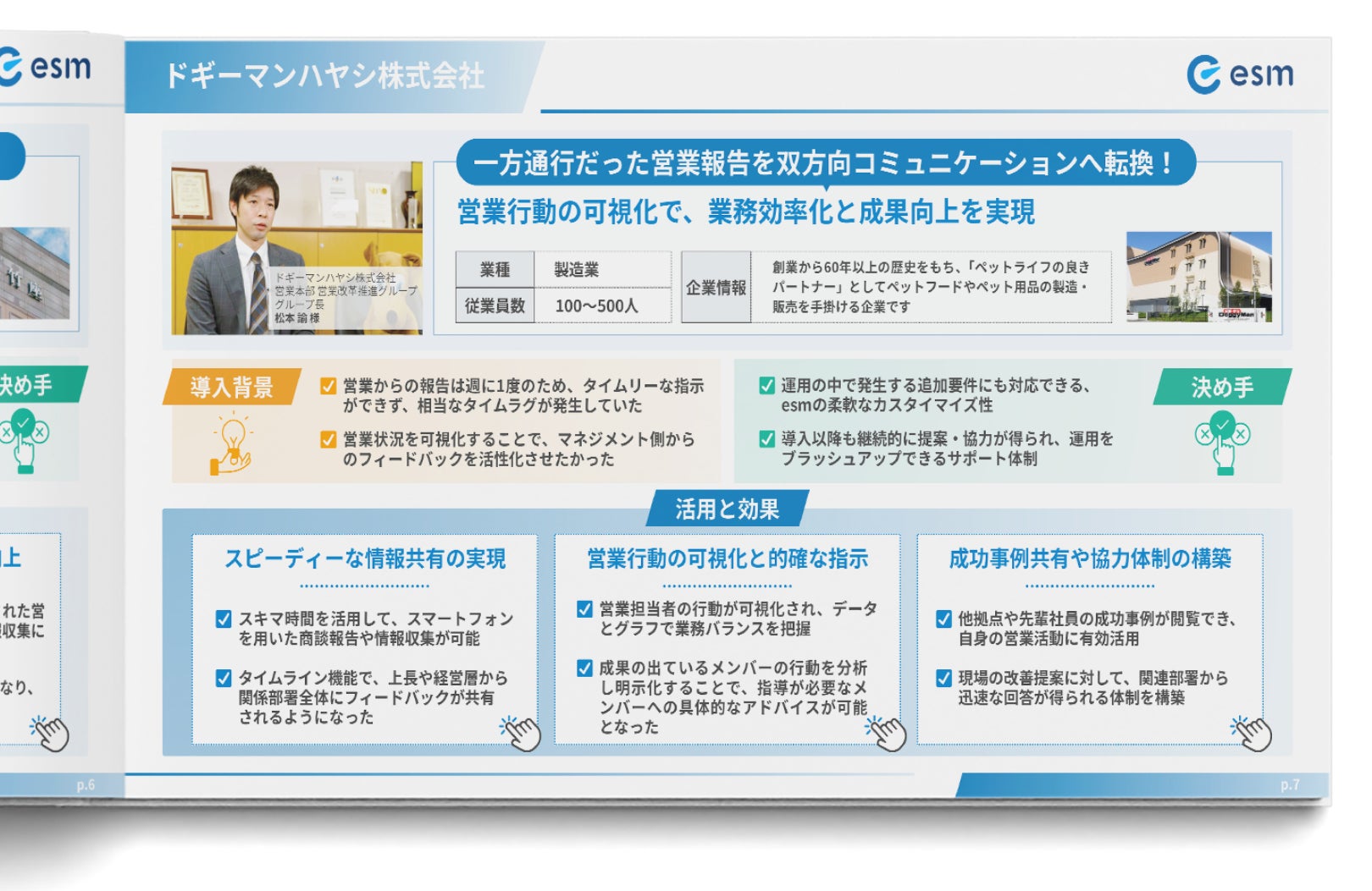 本資料では、これまでのesm(eセールスマネージャー)導入実績の中から、業種や規模の異なる7社を選出しました。各社の課題、eセールスマネージャーの導入によって得られた効果、その活用方法に焦点を当ててご紹介します。皆様の営業活動における脱属人化や営業プロセスの改善、そして持続的な成長を実現するための一助となれば幸いです。