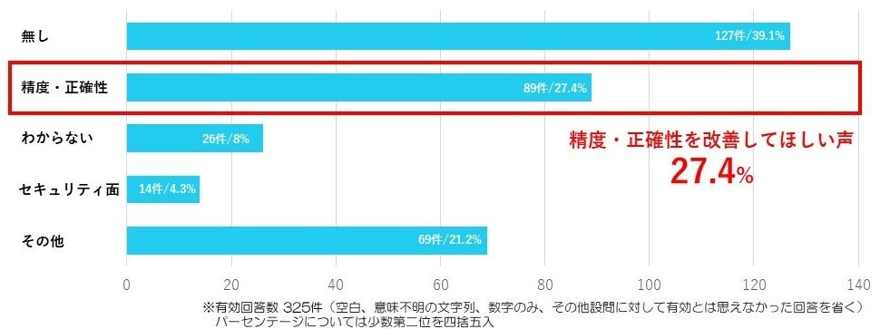 「精度」や「正確性」など生成された結果についての信頼性の改善に関する意見が最も多く27.4%となり、その他では「セキュリティ対策」や「著作権対策」などの法整備を求める意見がありました。
