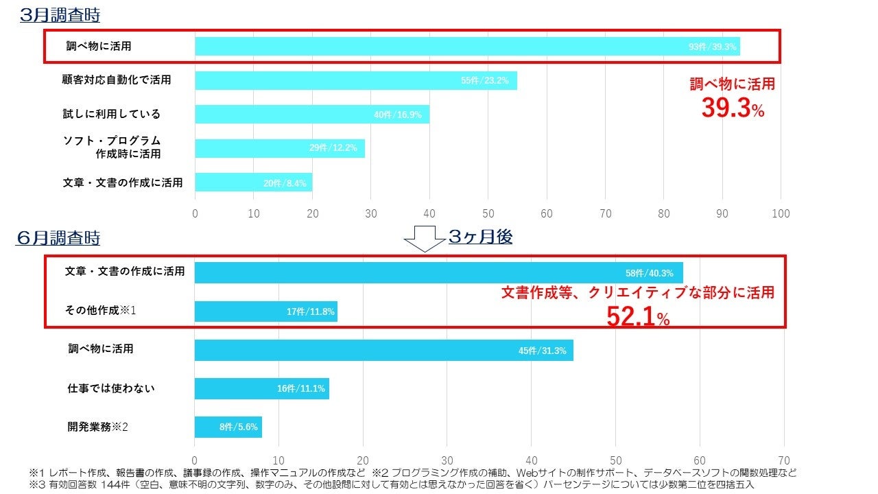 1.生成系AIは「文書の作成に活用」などクリエイティブな部分に活用するという意見が約20%に増加。