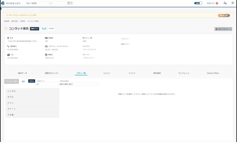 OTAを選んで検索すると、そのOTA上にある価格/在庫情報を表示します。