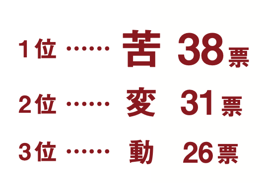 2023年は、新型コロナウイルスの感染拡大やロシアによるウクライナ侵攻など、世界中でさまざまな困難が続きました。 日本においても、物価高騰や円安など、生活に直結する問題が深刻化したことを背景として「苦」という字が選ばれました。第2位は「変」第3位は「動」と続きました。