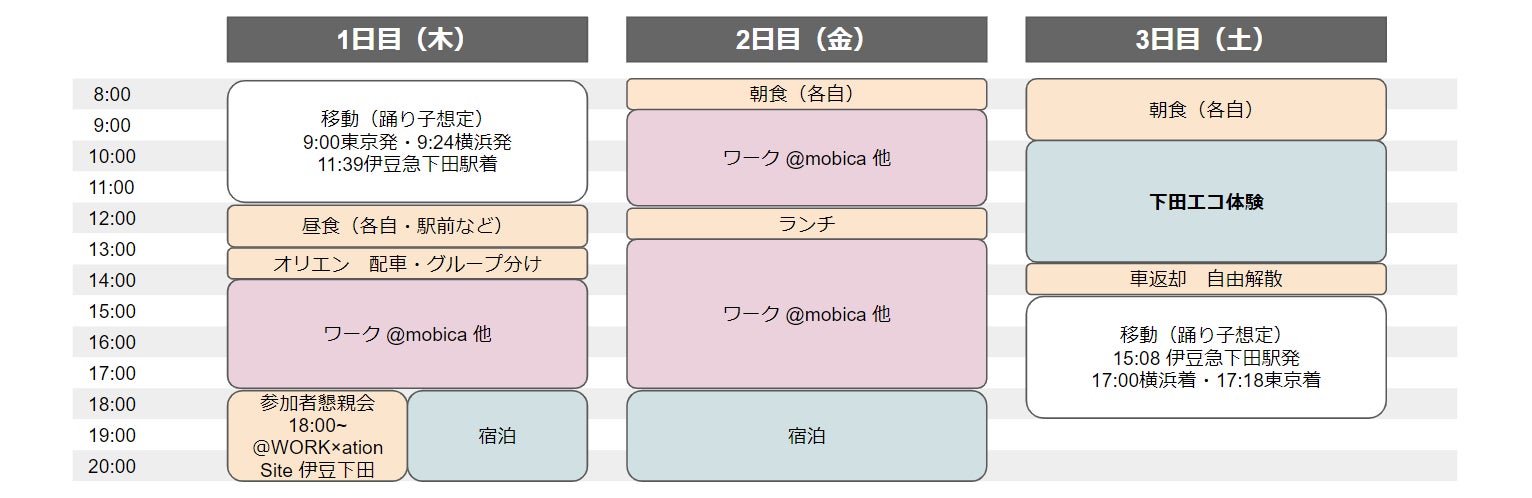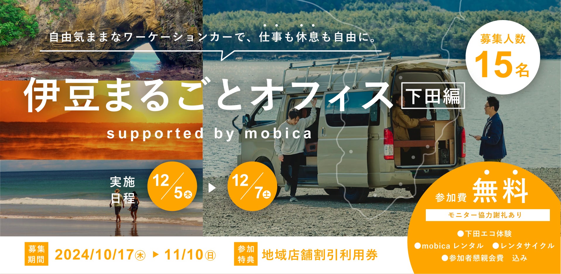 内容:エコツーリズムを体験できる下田市の全域をオフィスと見立て、ワーケーションカー「mobica」を使用して各地の豊かな自然を周遊する2泊3日のワーケーション企画
