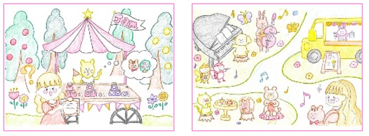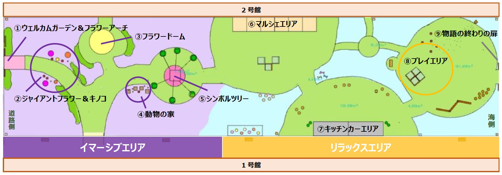 お花畑は2つのエリアに分かれます。寒色を中心とした花々で構成される「イマーシブエリア」では、生木と色彩豊かな造花で彩った高さ約5mのシンボルツリーをはじめ、フラワーアーチ、ジャイアントフラワー等のフォトジェニックなモニュメントで不思議な森を表現。森を抜けた先にある「リラックスエリア」では、淡色のお花畑や芝生が広がる癒しの空間の中、主人公が動物たちとパーティーを楽しんだように、キッチンカーでフラワーをモチーフにしたフード&ドリンク、週末ごとにテーマを変えて開催するマルシェでのお買い物をお楽しみください。