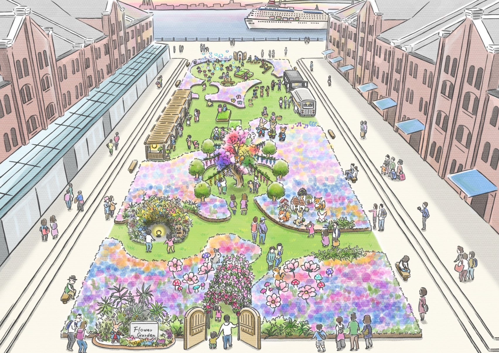横浜港を望む約1,200㎡の敷地に約2万株・15種類以上もの色とりどりのお花畑が広がります。今年は『不思議な森のフラワーティーパーティー』と題し、ある女の子が不思議な森に迷い込んで動物たちとパーティーを楽しむというオリジナルストーリーを軸に、お花畑の中で物語に沿ったモニュメントを発見したり、主人公になった気分で不思議な森の中で写真を撮ったりといった没入体験ができる“新感覚”のイベントとして展開します。