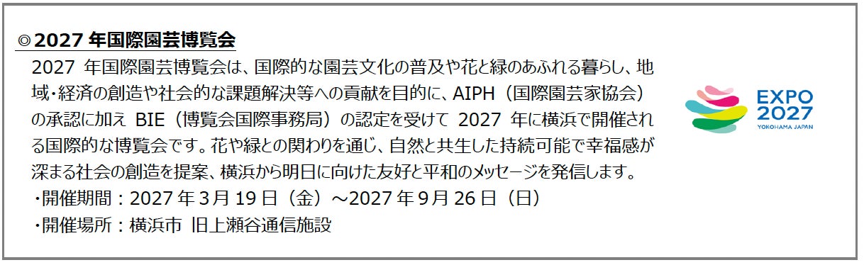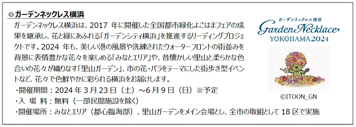 横浜市内で開催される「ガーデンネックレス横浜」や「2027年国際園芸博覧会」と広報連携し、イベントを通じたエリア一帯の賑わい創出を図ります。