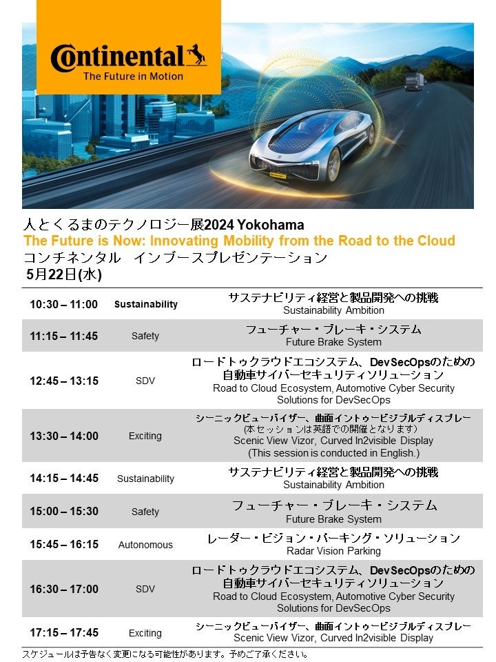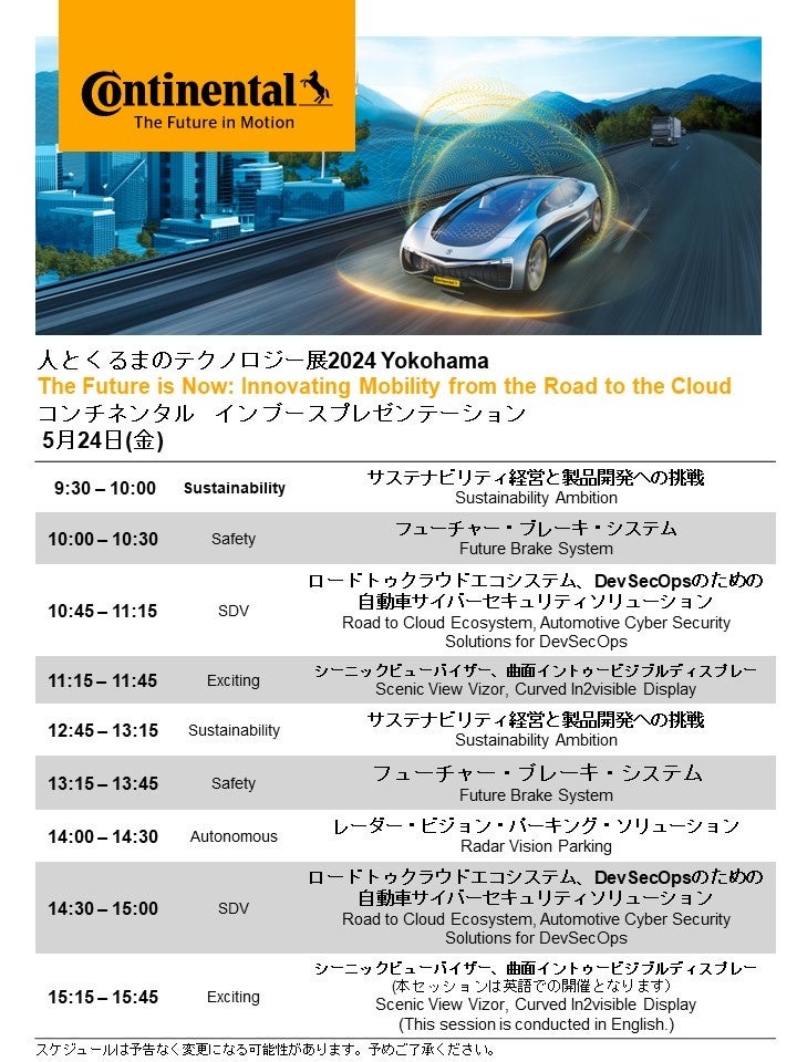 プレゼンテーションスケジュールは、特設サイト(https://www.continental.com/ja-jp/press/press-release/aee-2024/) または、以下をご覧ください。
