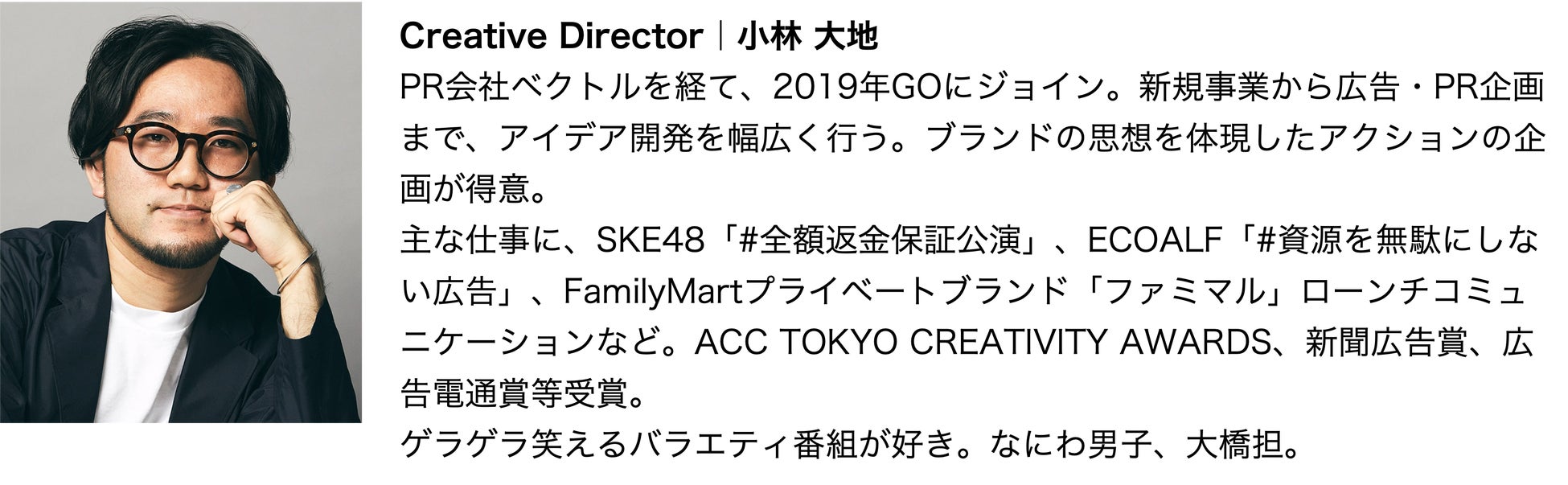 クリエイティビティを核に大企業の新規事業立ち上げから事業成長や組織戦略のサポートまで手がける。また、PR発想とクリエイティブを掛け合わせた、ニュースになるプロモーションを得意とする。
