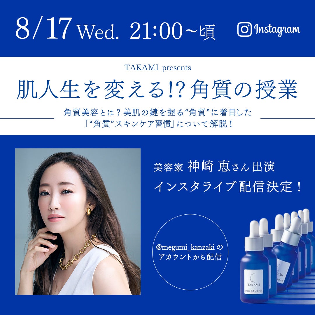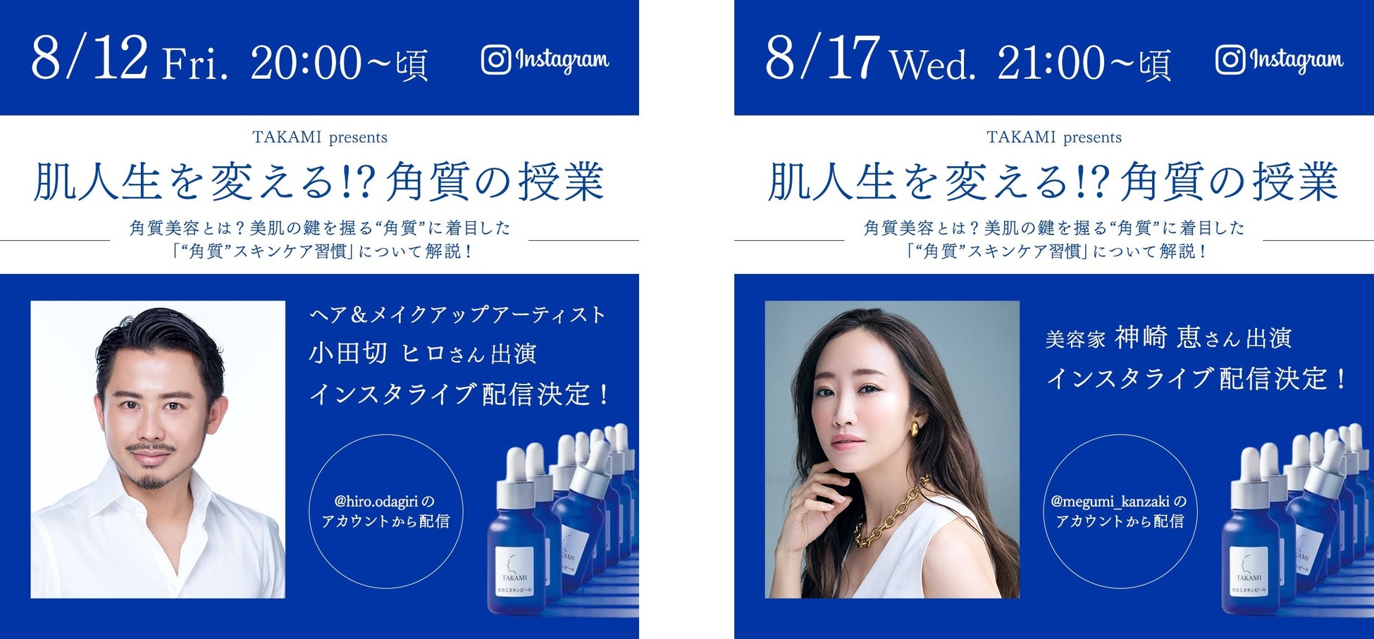 東京・表参道にある美容皮膚の現場で長年にわたりスキンケアの開発に携わってきたドクターズコスメブランド『タカミ』(本社:東京都中央区、www.takami-labo.com) は、この度、InstagramライブTAKAMI presents 「肌人生を変える!? 角質の授業」を2022年8月12日(金)、2022年8月17日(水)の2日間に渡り、2週連続で配信いたします。各回の講師には美容賢者として信頼の厚い小田切ヒロさん、神崎恵さんが、『タカミの提唱する「角質美容®」』を紐解きながら、“角質ケアの大切さ”や“美肌のカギは角質にある”ポイントなどを、ご自身の肌人生にまつわるエピソードをもとにレクチャーいただきます。