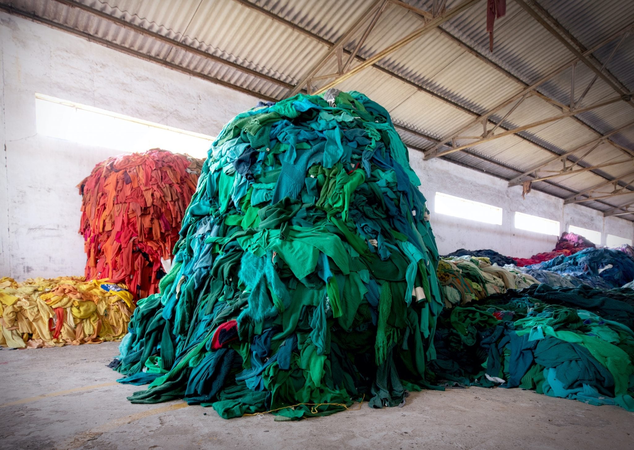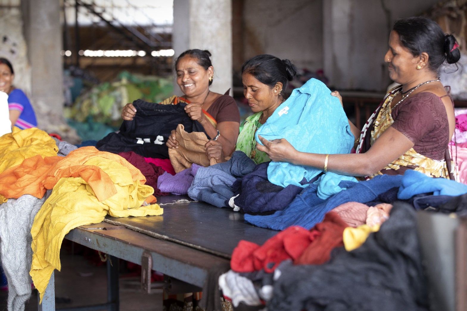 BRiCOのファクトリーでは、古着市場では販売することのできない大量の使用不能の古着を回収しています。そして、訓練を受けた従業員が綿やウール、アクリル、その他合成繊維の衣類を手作業で分別。さらに色別に分けた後衣類を機械で分解し、繊維に戻していきます。回収された繊維は、強度を高めるために、再生ポリエステルとブレンドされ、紡績工程を経て、編み物や織物に適した糸となり、サステナブルなプロダクトへと生まれ変わります。